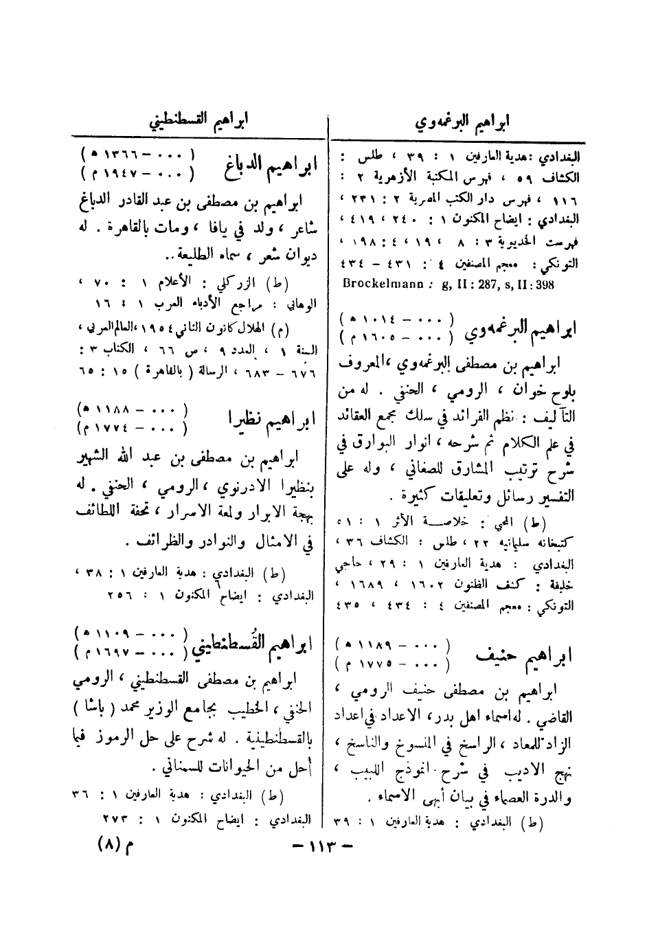 (ط) المحبي: خلاصة الاثر 1: 51 كتبخانه سليمانيه 22، طلس: الكشاف 36، البغدادي: هدية العارفين 1: 29، حاجي خليفة: كشف الظنون 1602، 1689، التونكي: معجم المصنفين 4: 434، 435 ابراهيم حنيف (000 - 1189 هـ) (000 - 1775 م) ابراهيم بن مصطفى حنيف الرومي، القاضي.
