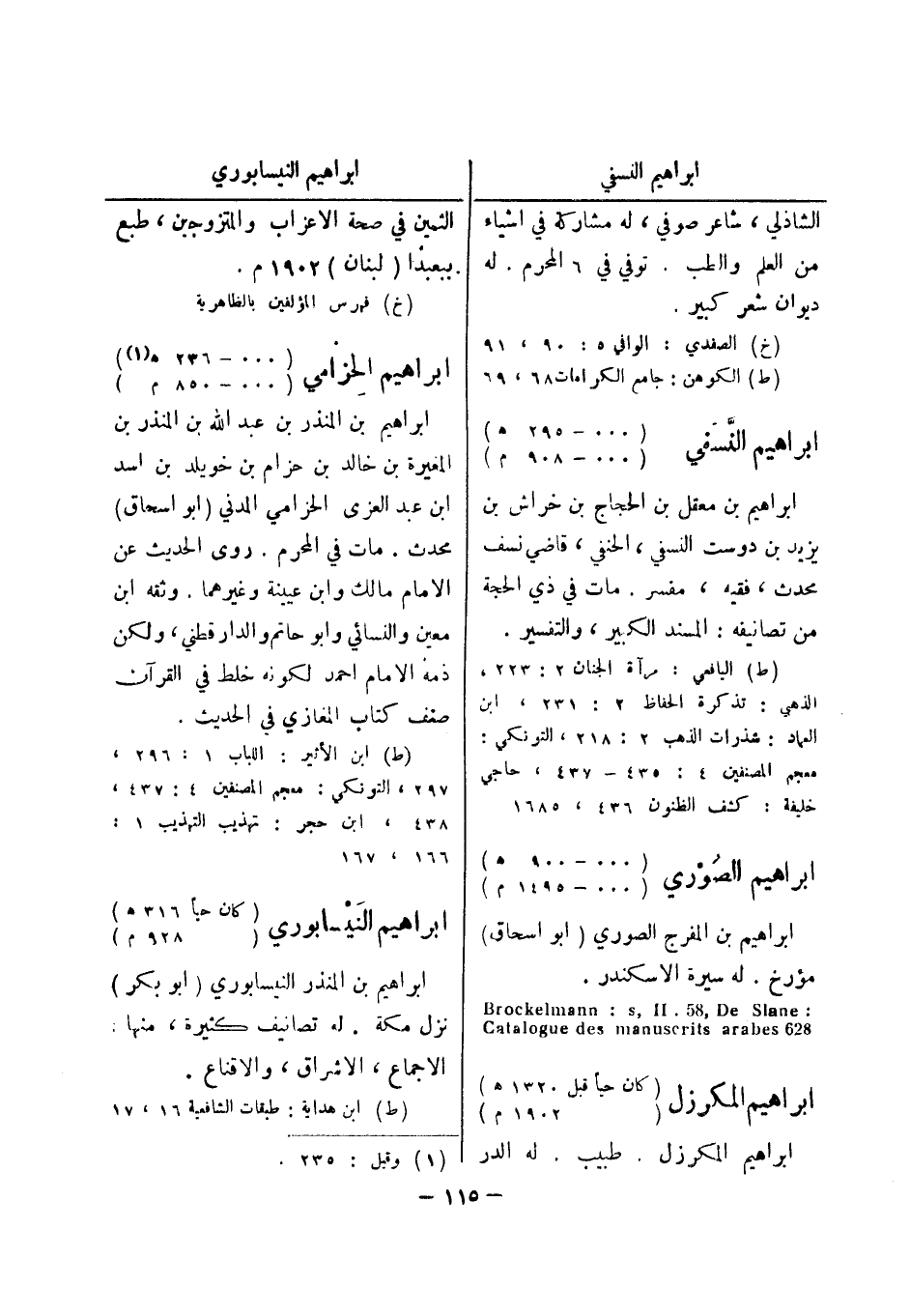 (ط) ابن الاثير: اللباب 1: 296، 297، التونكي: معجم المصنفين 4: 437، 438، ابن حجر: تهذيب التهذيب 1: 166، 167 ابراهيم النيسابوري (كان حيا " 316 هـ) (928 م) ابراهيم بن المنذر النيسابوري (أبو بكر) نزل مكة.