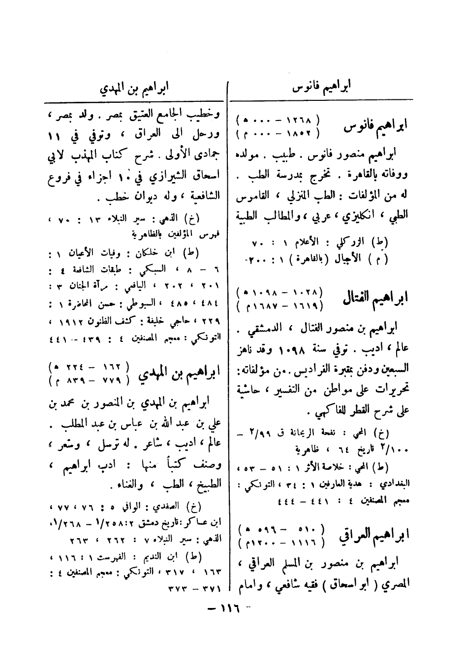فهرس المؤلفين بالظاهرية (ط) ابن خلكان: وفيات الاعيان 1: 6 - 8، السبكي: طبقات الشافعة 4: 201، 202، اليافعي: مراة الجنان 3: 484، 485، السيوطي: حسن المحاضرة 1: 229، حاجي خليفة: كشف الظنون 1912، التونكي: معجم المصنفين 4: 439 - 441 ابراهيم بن المهدي (162 - 224 هـ) (779 - 839 م) ابراهيم بن المهدي بن المنصور بن محمد بن علي بن عبد الله بن عباس بن عبد المطلب.