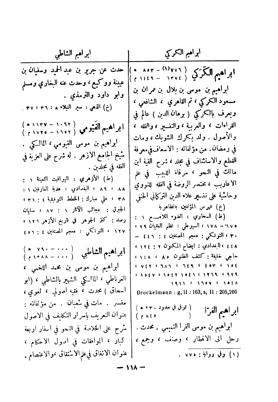 (ط) الازهري: اليواقيت الثمينة 1: 88، 89، البغدادي: هدية العارفين 1: 38، على مبارك: الخطط التوفيقية 4: 31، الجبرتي: عجائب الآثار 1: 87، سليمان رصد: كنز الجوهر في تاريخ الازهر 126، 127، التونكي: معجم المصنفين 4: 456 ابراهيم الشاطبي (000 - 790 هـ) (000 - 1388 م) ابراهيم بن موسى بن محمد اللخمي، الغرناطي، المالكي الشهير بالشاطبي، (أبو اسحاق) محدث، فقيه اصولي، لغوي، مفسر.