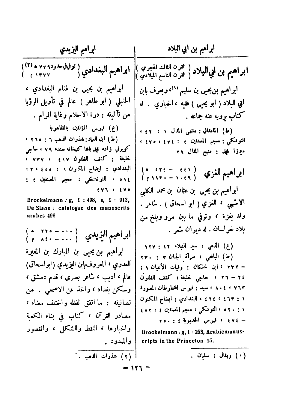 496 arabes De Slane: catalogue des manuscrits ابراهيم اليزيدي (000 - 225 هـ) (000 - 840 م) ابراهيم بن يحيى بن المبارك بن المغيرة العدوي، المعروف بابن اليزيدي (أبو اسحاق) عالم، اديب، شاعر بصرى، قدم دمشق، وسكن بغداد، واخذ عن الاصمعي.