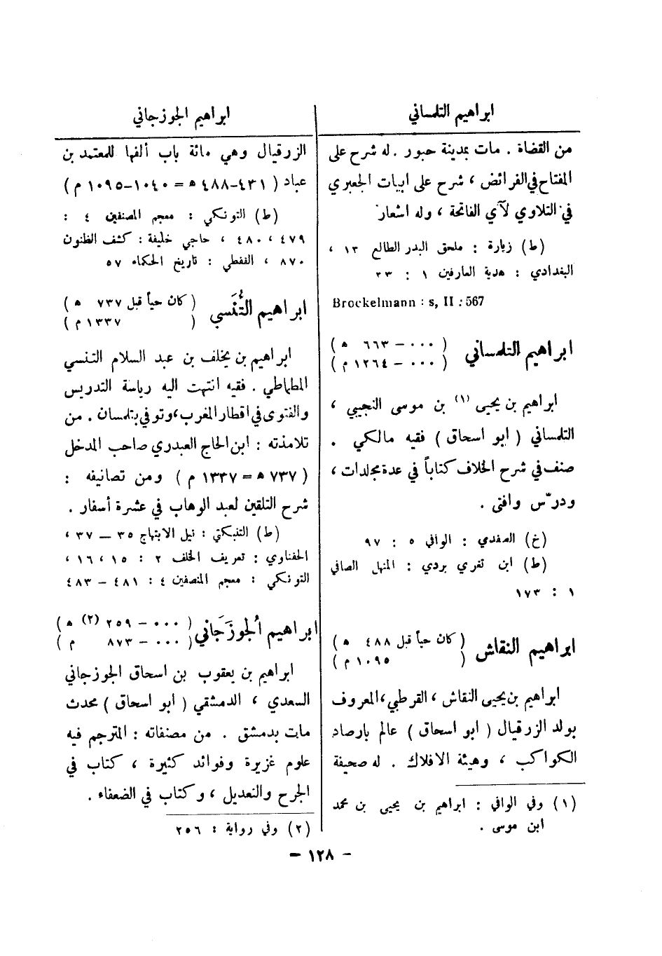(ط) التنبكتي: نيل الابتهاج 35 - 37، الحفناوي: تعريف الخلف 2: 15، 16، التونكي: معجم المصنفين 4: 481 - 483 ابراهيم الجوزجاني (000 - 259 (2) هـ) (000 - 873 م) ابراهيم بن يعقوب بن اسحاق الجوزجاني السعدي، الدمشقي (أبو اسحاق) محدث مات بدمشق.