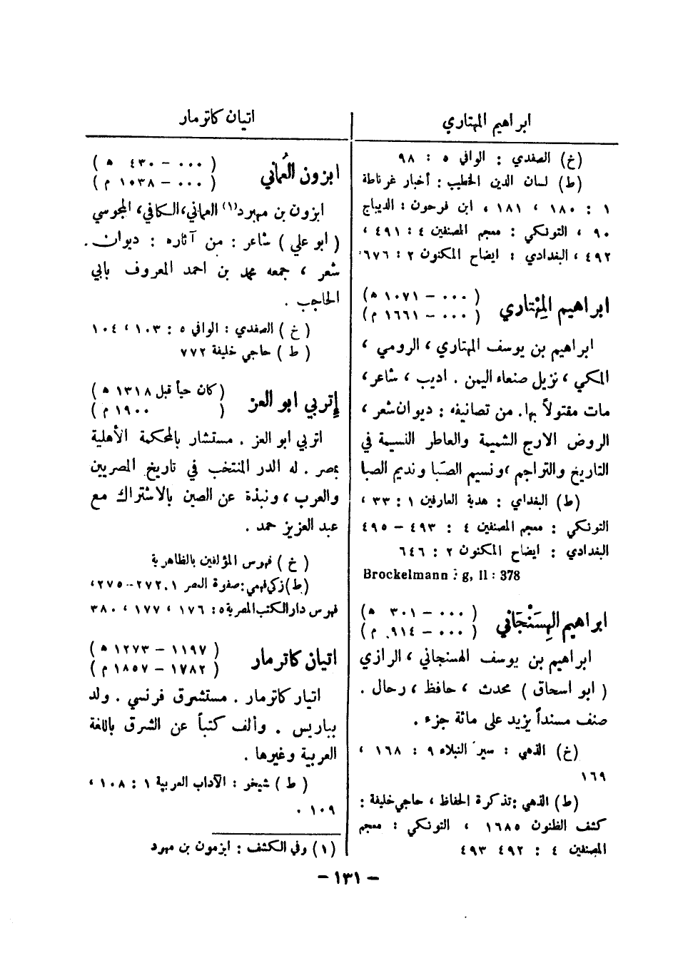 (ط) الذهبي: تذكرة الحفاظ، حاجي خليفة: كشف الظنون 1685، التونكي: معجم المصنفين 4: 492، 493 ابزون العماني (000 - 430 هـ) (000 - 1038 م) ابزون بن مهبرد (1) العماني، الكافي، المجوسي (أبو علي) شاعر: من آثاره ديوان.