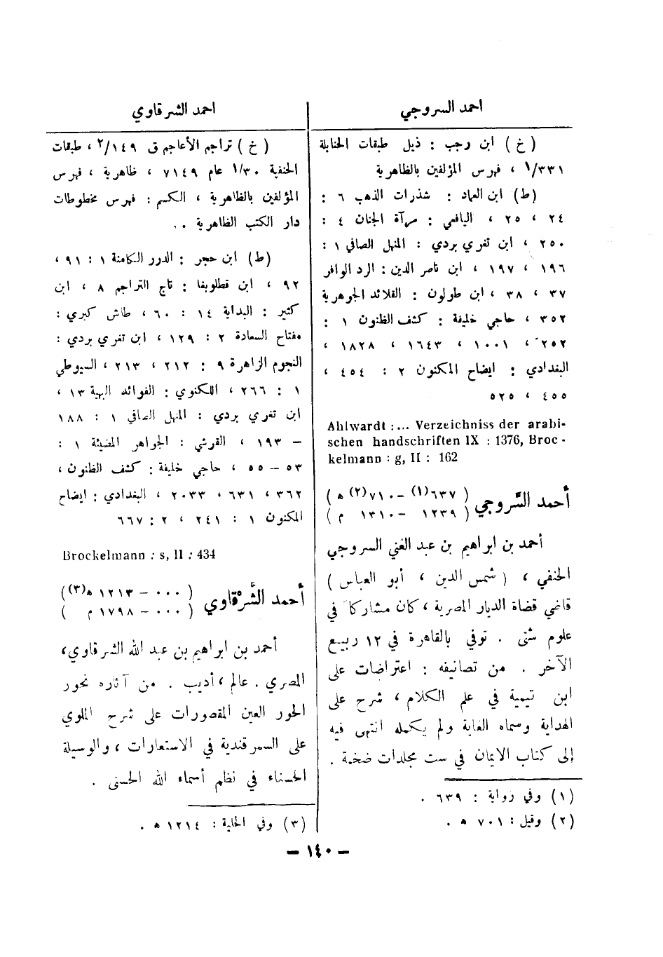 (ط) ابن حجر: الدرر الكامنة 1: 91، 92، ابن قطلوبغا: تاج التراجم 8، ابن كثير: البداية 14: 60، طاش كبري: مفتاح السعادة 2: 129، ابن تغري بردي: النجوم الزاهرة 9: 212، 213، السيوطي 1: 266، اللكنوي: الفوائد البهية 13، ابن تغري بردي: المنهل الصافي 1: 188 - 193، القرشي: الجواهر المضيئة 1: 53 - 55، حاجي خليفة: كشف الظنون، 362، 631، 2033، البغدادي: ايضاح المكنون 1: 241، 2: 667 434: Brockelemann: s , II أحمد الشرقاوي (000 - 1213 هـ (3) (000 - 1798 م) أحمد بن ابراهيم بن عبد الله الشرقاوي، المصري.