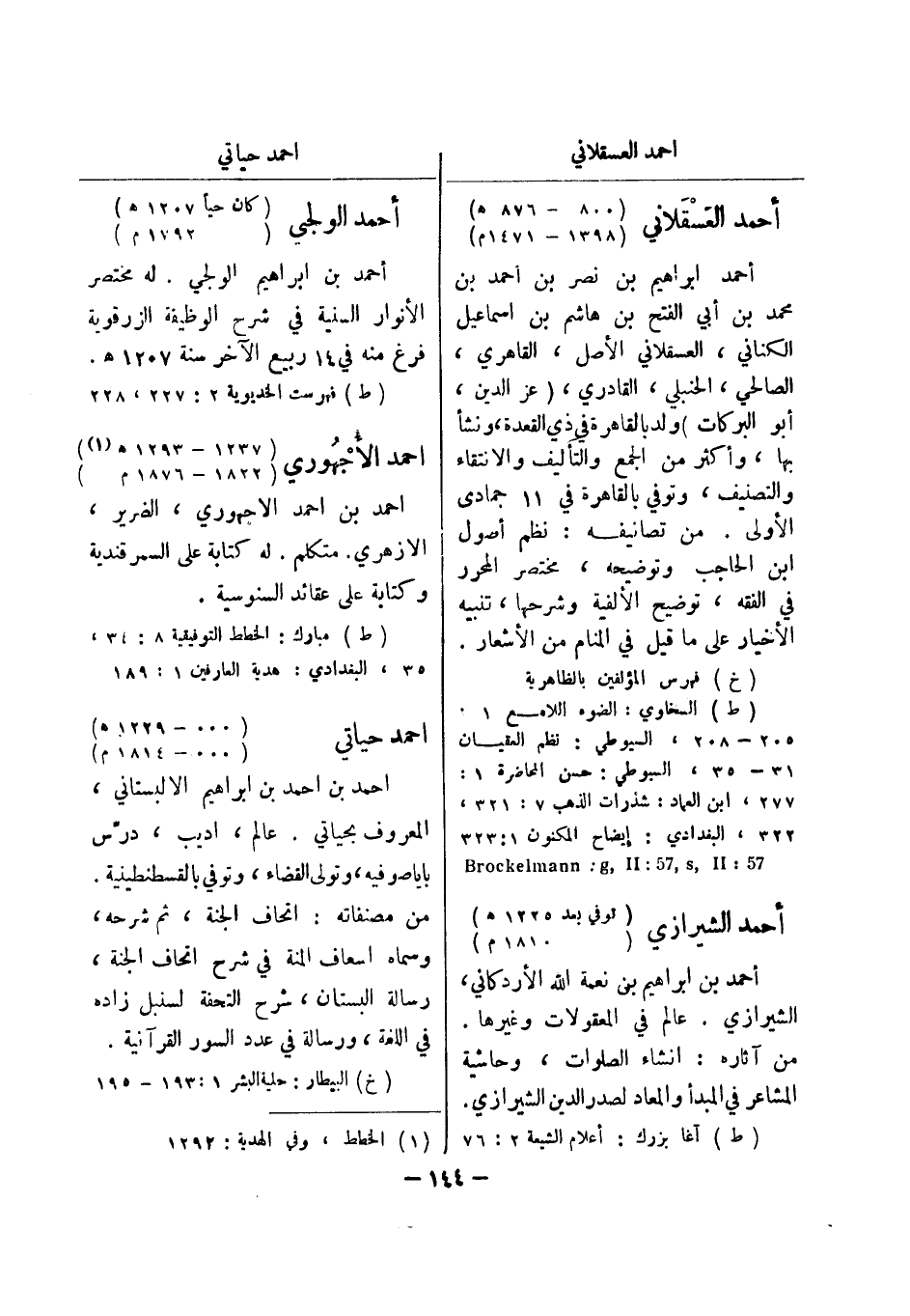 (خ) فهرس المؤلفين بالظاهرية (ط) السخاوي: الضوء اللامع 1: 205 - 208، السيوطي: نظم العقيان 31 - 35، السيوطي: حسن المحاضرة 1: 277، ابن العماد: شذرات الذهب 7: 321، 322، البغدادي: إيضاح المكنون 1: 323 57: Brockelmann: g , II: 75 , s , II أحمد الشيرازي (توفي بعد 1225 هـ) (1810 م) أحمد بن ابراهيم بن نعمة الله الاردكاني،