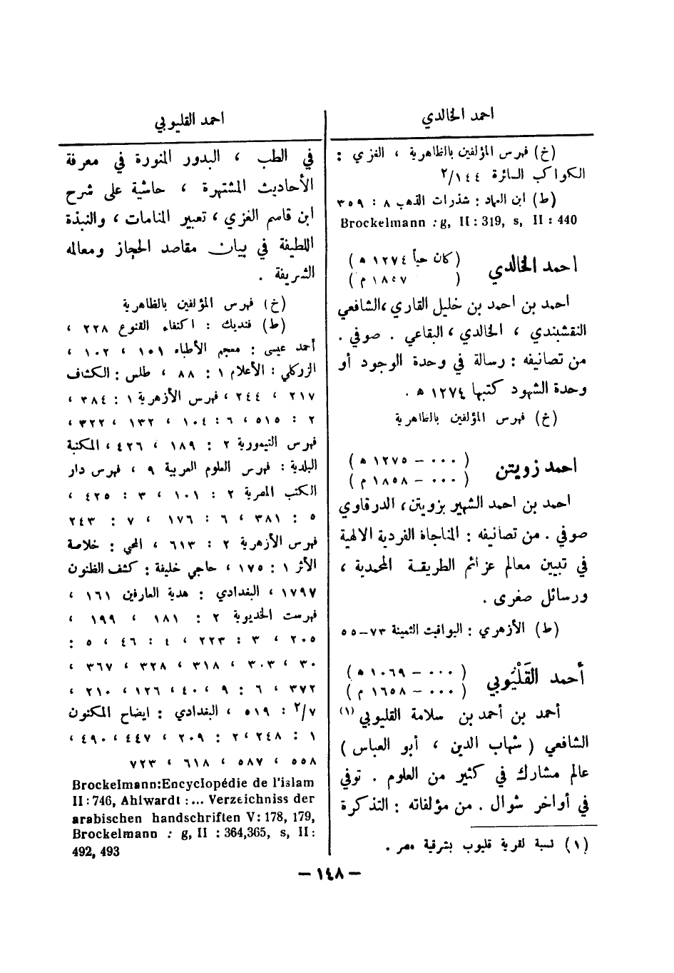(خ) فهرس المؤلفين بالظاهرية، الغزى: الكواكب السائرة 144 / 2 (ط) ابن العماد: شذرات الذهب 8: 359 440: Brockelmann: g , II: 913 , s , II احمد الخالدي (كان حيا " 1274 هـ) (1875 م) احمد بن احمد بن خليل القاري، الشافعي النقشبندي، الخالدي، البقاعي.