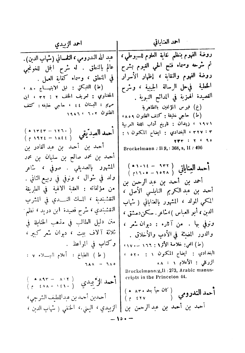 (خ) فهرس المؤلفين بالظاهرية (ط) حاجي خليفة: كشف الظنون 859، 1971، زيدان: تاريخ آداب اللغة العربية 3: 327، البغدادي: ايضاح المكنون 1:، 95، 2: 233 496: Brockelmann: g , II: 863 , s , II أحمد العناياتى (932 - 1014 هـ) (1528 - 1605 م) أحمد بن أحمد بن عبد الرحمن بن أحمد بن عبد الكريم النابلسي الاصل، المكي المولد، المشهور بالعناياتي (شهاب الدين، أبو العباس) ، شاعر.