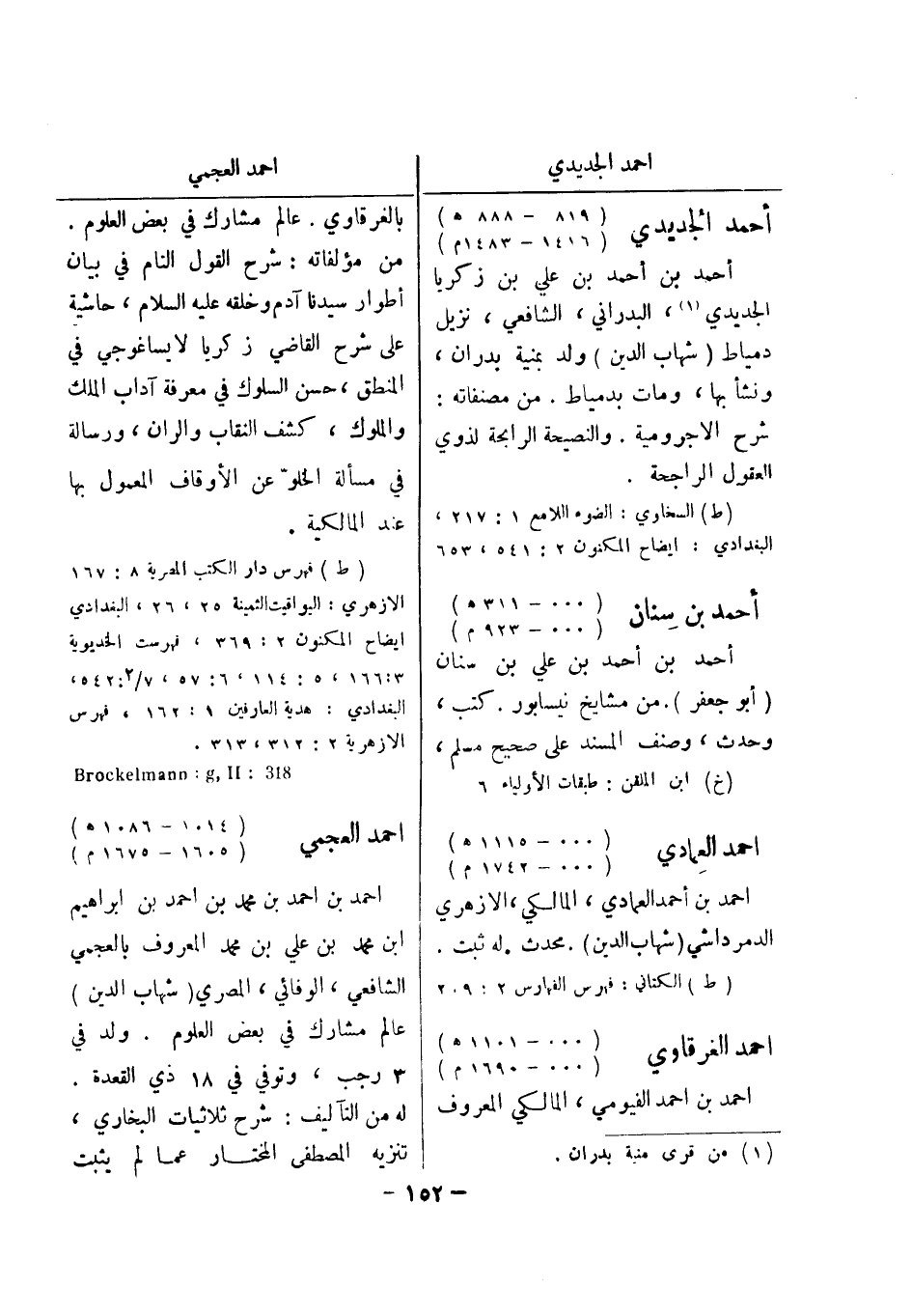 318: Brockelmann: g , II احمد العجمي (1014 - 1086 هـ) (1605 - 1675 م) احمد بن احمد بن محمد بن احمد بن ابراهيم ابن محمد بن علي بن محمد المعروف بالعجمي الشافعي، الوفائي، المصري (شهاب الدين) عالم مشارك في بعض العلوم.