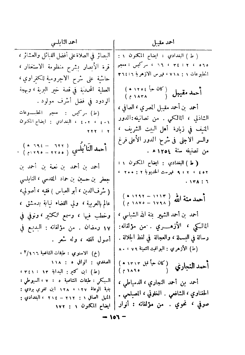 (ط) سر كيس: معجم المطبوعات 401، 402، البغدادي: ايضاح المكنون 2: 222 أحمد النابلسي (622 - 694 هـ) (2255 - 2295؟ م) أحمد بن أحمد بن نعمة بن أحمد بن جعفر بن حسين بن حماد المقدسي، النابلسي (شرف الدين، أبو العباس) فقيه، أصولي، عالم بالعربية، ولي القضاء نيابة بدمشق، وخطب فيها، وسمع الكثير، وتوفي في 17 رمضان.