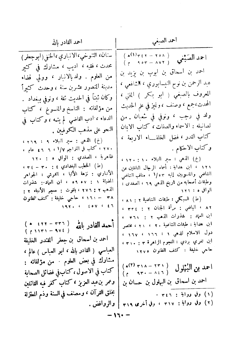 (خ) الذهبي: سير النبلاء 9: 269، 270، كتاب في التراجم 7 / 1، 46 6 عام، ظاهرية، الصفدي: الوافي 5: 120 (ط) الخطيب البغدادي 4: 30 - 34، الانباري: نزهة الالبا، الفرشي: الجواهر المضيئة 1: 59 57، ابن العماد: شذرات الذهب 2: 276، ياقوت: معجم الادباء 2: 38 - 161، حاجي خليفة: كشف الظنون 46، 457، 1920 أحمد القادر بالله (336 - 422 هـ) (974 - 1131 م) احمد بن اسحاق بن جعفر المقتدر الخليفة
