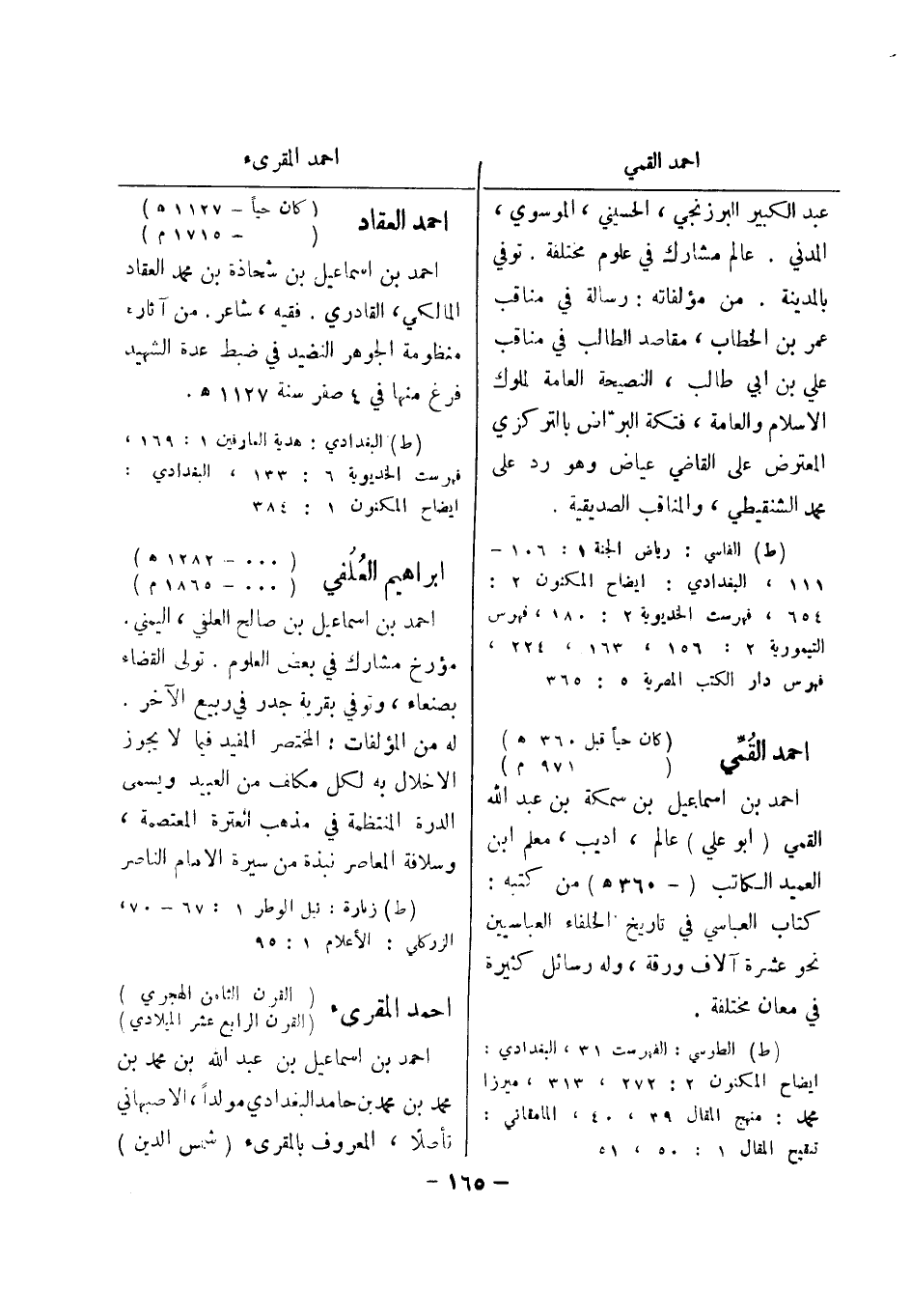 111، البغدادي: ايضاح المكنون 2: 654، فهرست الخديوية 2: 180، فهرس التيمورية 2: 156، 163، 224، فهرس دار الكتب المصرية 5: 365 احمد القمي (كان حيا قبل 360 هـ) (971 م) احمد بن اسماعيل بن سمكة بن عبد الله القمي (أبو علي) عالم، اديب، معلم ابن العميد الكاتب (- 360 هـ) من كتبه: كتاب العباسي في تاريخ الخلفاء العباسيين نحو عشرة آلاف ورقة، وله رسائل كثيرة في معان مختلفة.