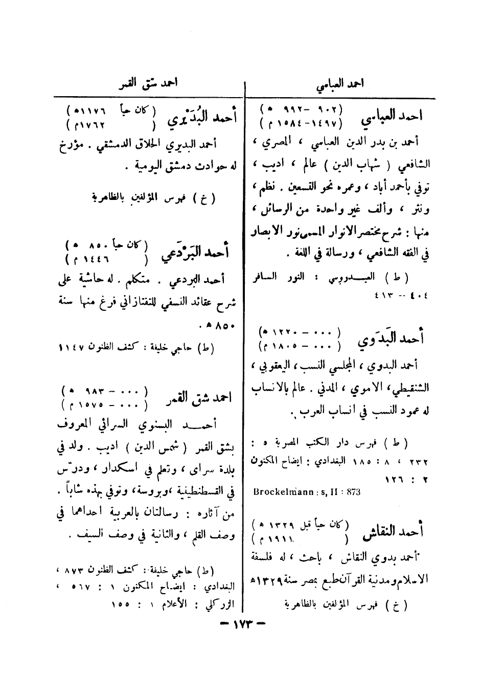 (ط) فهرس دار الكتب المصرية 5: 232، 8: 185 البغدادي: ايضاح المكنون 2: 126 873: Brockelmann: s , II أحمد النقاش (كان حيا قبل 1329 هـ) (1911 م) أحمد بدوي النقاش، باحث، له فلسفة الاسلام ومدينة القرآن طبع بمصر سنة 1329 هـ (خ) فهرس المؤلفين بالظاهرية أحمد البديري (كان حيا 1176 هـ) (1762 م) أحمد البديري الحلاق الدمشقي.