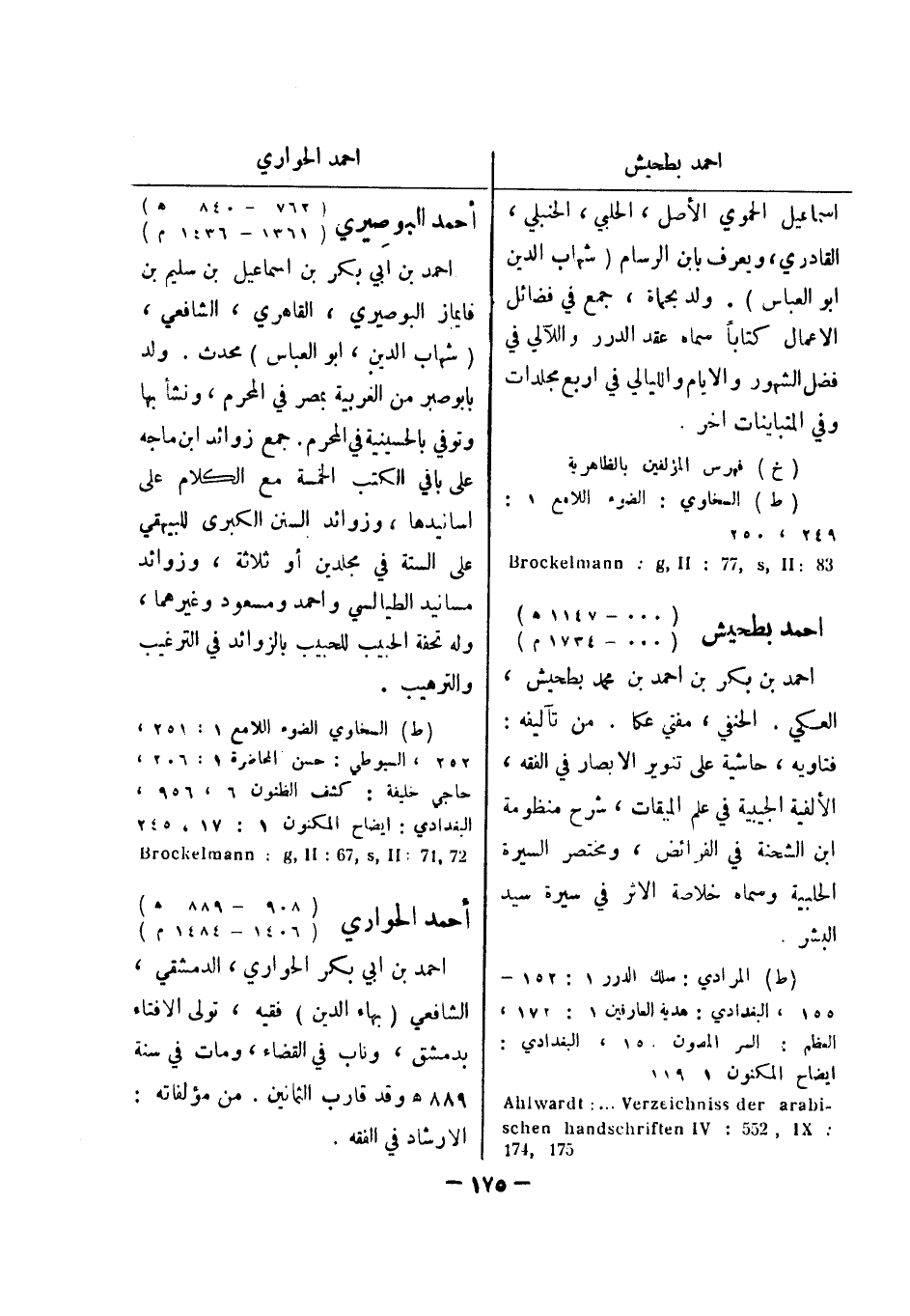 (ط) السخاوي الضوء اللامع 1: 251، 252، السيوطي: حسن المحاضرة 1: 206، حاجي خليفة: كشف الظنون 6، 956، البغدادي: ايضاح المكنون 1: 17، 245 72 , 71: Brockelmann: g , II: 76 , s , II أحمد الحواري (908 - 889 هـ) (1406 - 1484 م) احمد بن ابي بكر الحواري، الدمشقي، الشافعي (بهاء الدين) فقيه، تولى الافتاء بدمشق، وناب في القضاء، ومات في سنة 889 هـ وقد قارب الثمانين.