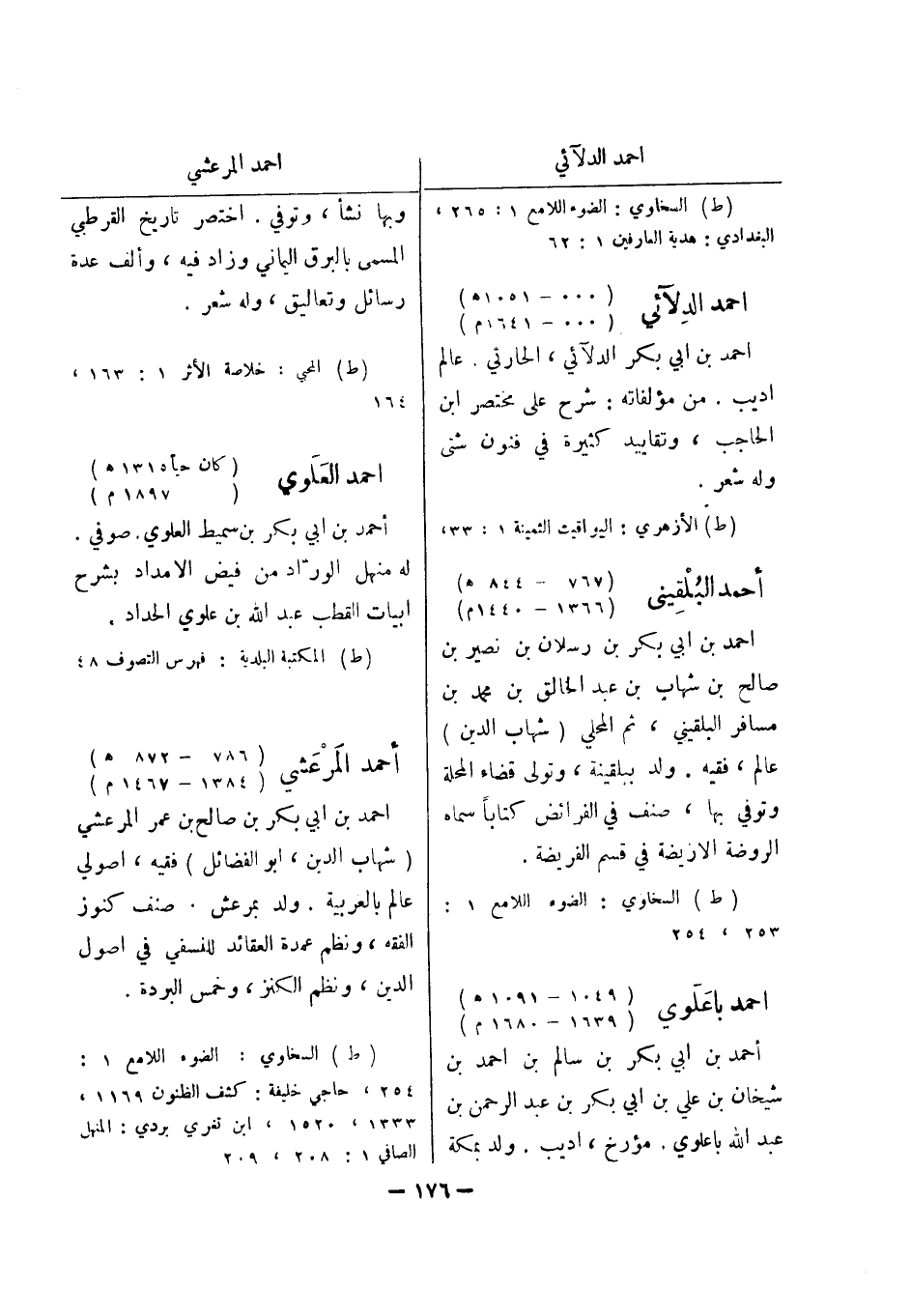 (ط) السخاوي: الضوء اللامع 1: 265، البغدادي: هدية العارفين 1: 62 احمد الدلآئي (000 - 1051 هـ) (000 - 1641 م) احمد بن ابي بكر الدلآئي، الحارثي.