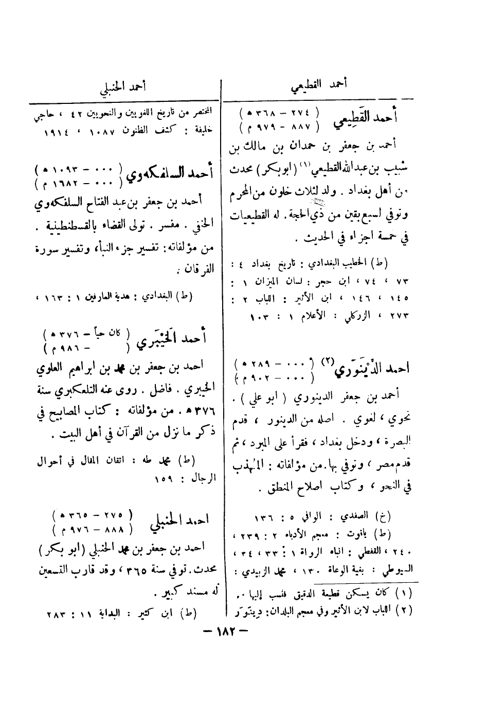 (ط) محمد طه: اتقان المقال في أحوال الرجال: 159 احمد الحنبلي (275 - 365 هـ) (888 - 976 م) احمد بن جعفر بن محمد الحنبلي (أبو بكر) محدث.