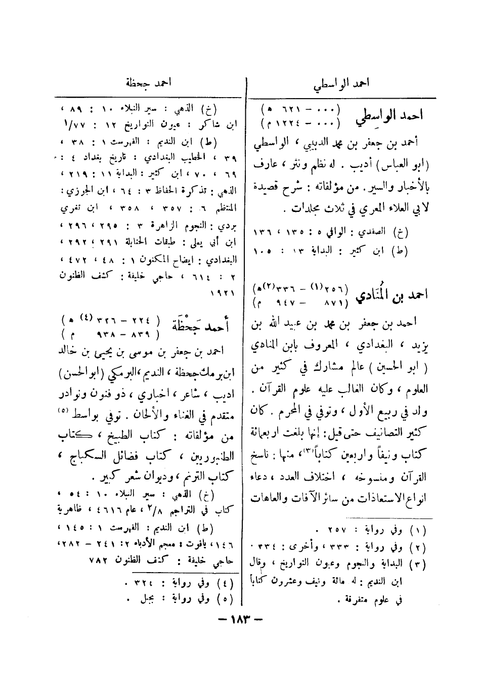 (خ) الصفدي: الوافي 5: 135، 136 (ط) ابن كثير: البداية 13: 105 احمد بن المنادي (256 (1) - 336 (2) هـ) (871 - 947 م) احمد بن جعفر بن محمد بن عبيد الله بن يزيد، البغدادي، المعروف بابن المنادي (أبو الحسين) عالم مشارك في كثير من العلوم، وكان الغالب عليه علوم القرآن.