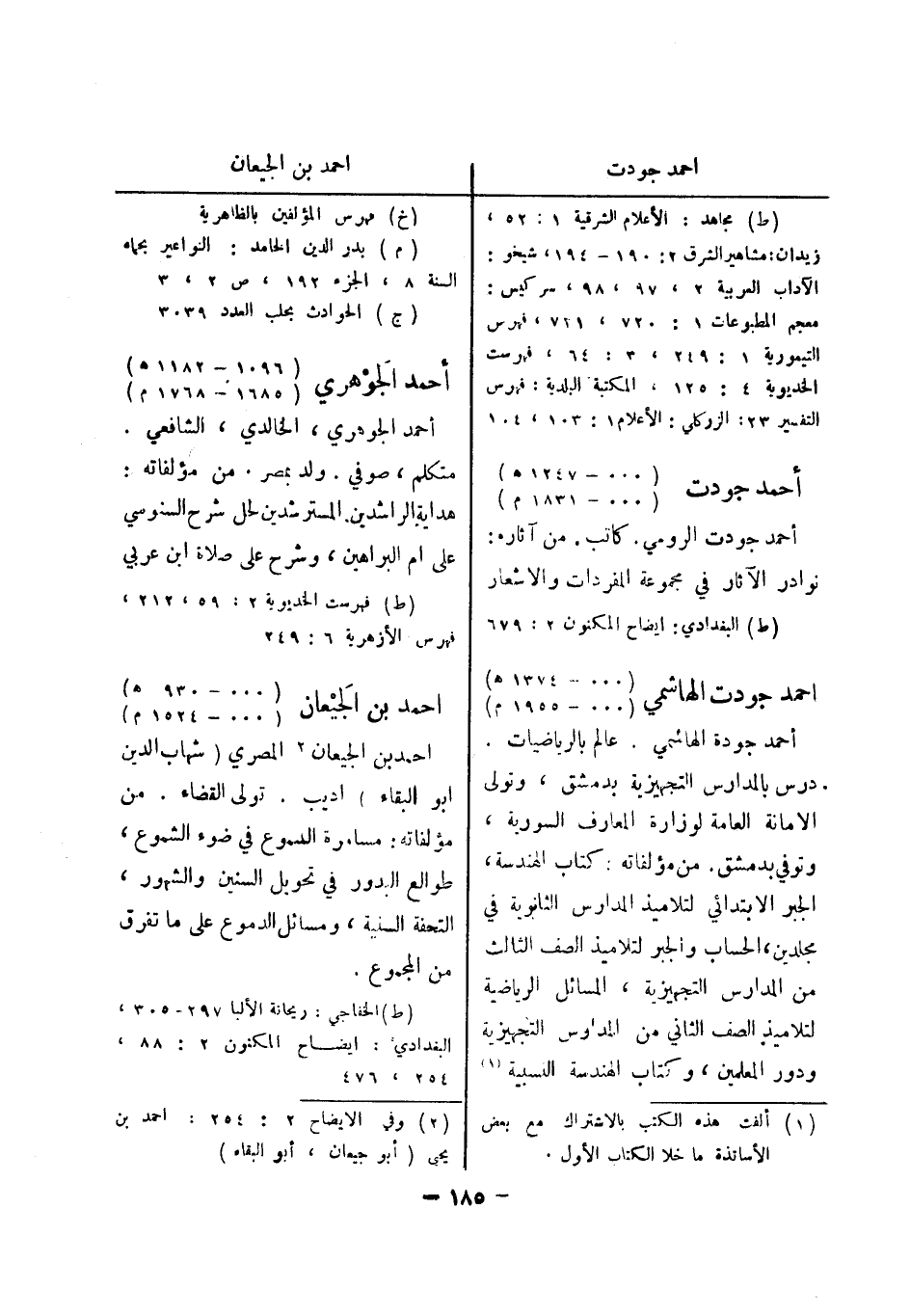 (ط) مجاهد: الاعلام الشرقية 1: 52، زيدان: مشاهير الشرق 2: 190 - 194، شيخو: الآداب العربية 2، 97، 98، سر كيس: معجم المطبوعات 1: 720، 721، فهرس التيمورية 1: 249، 3: 64، فهرست الخديوية 4: 125، المكتبة البلدية: فهرس التفسير 23: الزر كلي: الاعلام 1: 103، 104 أحمد جودت (000 - 1247 هـ) (000 - 1831 م) أحمد جودت الرومي.