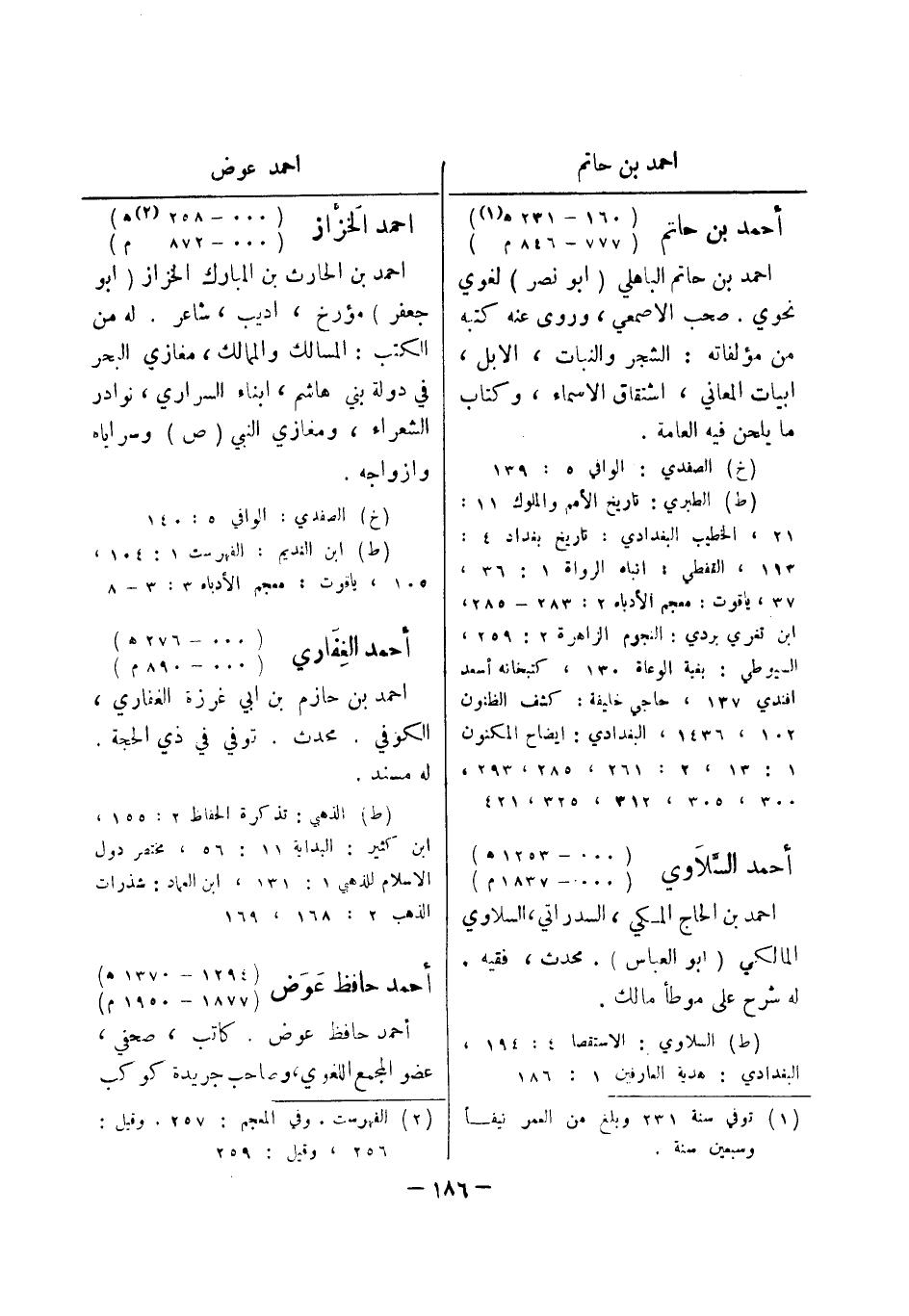 (ط) الذهبي: تذكرة الحفاظ 2: 155، ابن كثير: البداية 11: 56، مختصر دول الاسلام للذهبي 1: 131، ابن العماد: شذرات الذهب 2: 168، 169 أحمد حافظ عوض (1294 - 1370 هـ) (1877 - 1950 م) أحمد حافظ عوض.