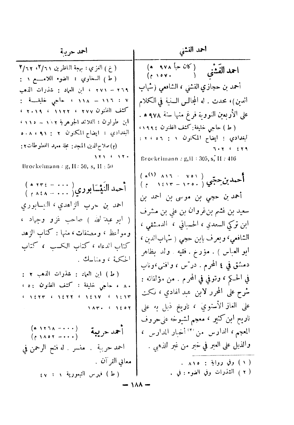 (ط) ابن العماد: شذرات الذهب 2: 80، حاجي خليفة: كشف الظنون 54، 1413، 1417، 1422، 1423، 1452، 1830 أحمد حربية (000 - 1268 هـ) (000 - 1852 م) احمد حربية.