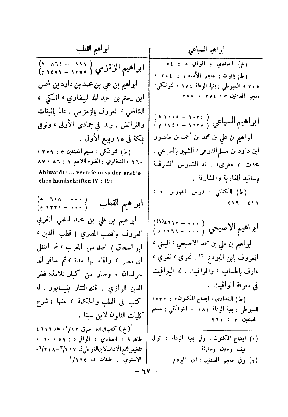 (ط) ياقوت: معجم الادباء 1: 204، 205، السيوطي: بغية الوعاة 184، التونكي: معجم المصنفين 3: 274، 275 ابراهيم السباعي (1034 - 1155 هـ) (1625 - 1742 م) ابراهيم بن علي بن محمد بن أحمد بن منصور ابن داود بن مسلم الدرعي، الشهير بالسباعي.