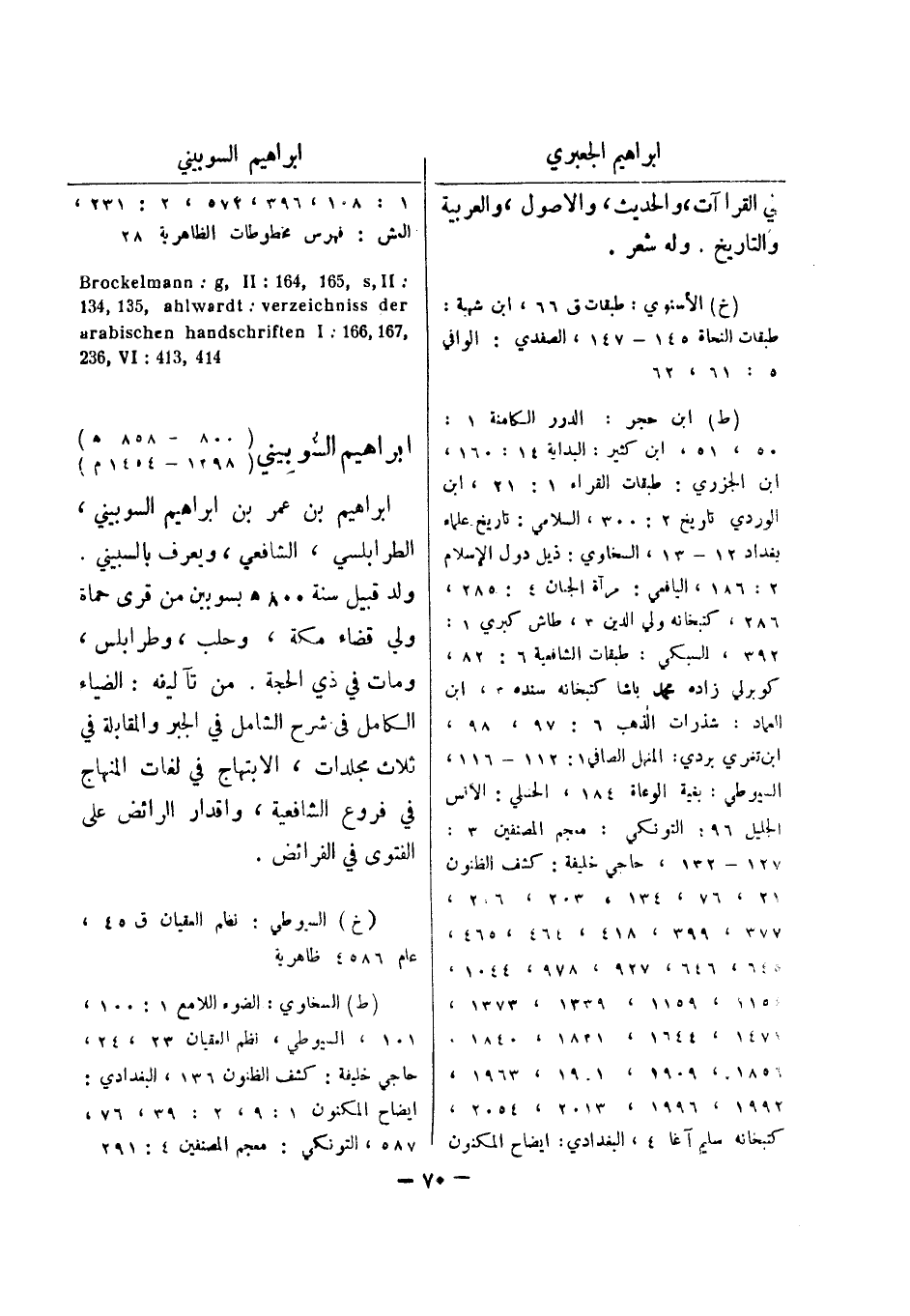 1992، 1996، 2013، 2054، كتبخانه سليم آغا 4، البغدادي: ايضاح المكنون 1: 108، 396، 574، 2: 231، العش: فهرس مخطوطات الظاهرية 28: Brockelmann: g , II: 461 , 561 , s , II 431 , 531 , ahlwardt: verzeichniss der 414 , 413: 632 , VI , 167 , 166: arabischen handschriften I ابراهيم السوبيني (800 - 858 هـ) (1498 - 1454 م) ابراهيم بن عمر بن ابراهيم السوبيني، الطرابلسي، الشافعي، ويعرف بالسبيني.