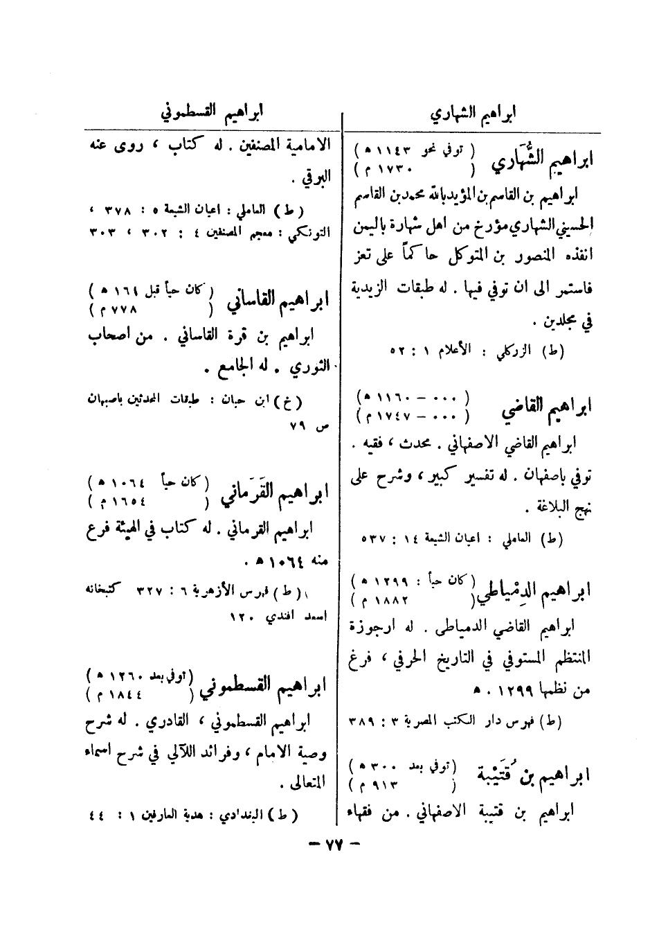 (ط) العاملي: اعيان الشيعة 5: 378، التونكي: معجم المصنفين 4: 302، 303 ابراهيم القاساني (كان حيا " قبل 161 هـ) (778 م) ابراهيم بن قرة القاساني.