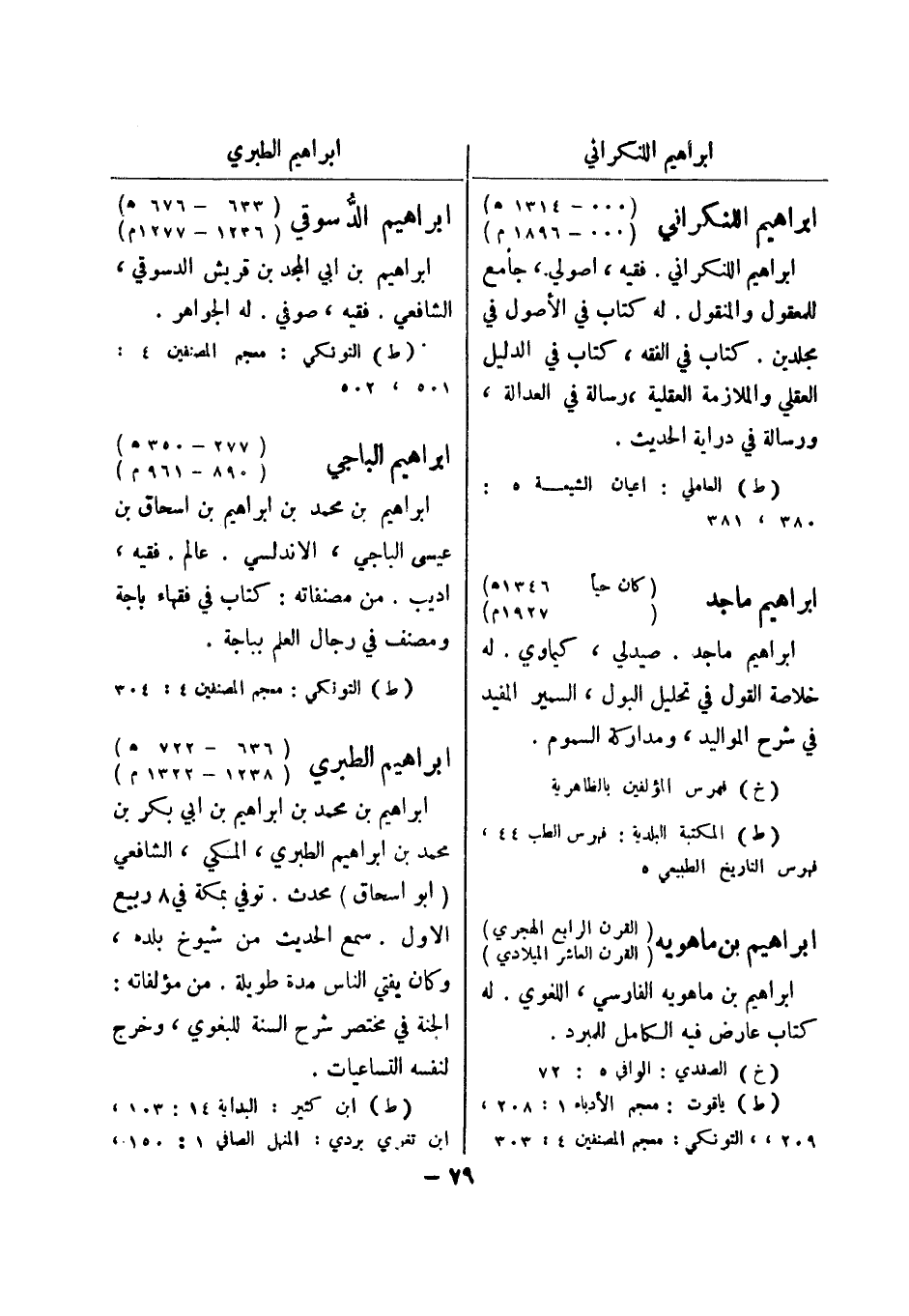 (ط) التونكي: معجم المصنفين 4: 304 ابراهيم الطبري (636 - 722 هـ) (1238 - 1322 م) ابراهيم بن محمد بن ابراهيم بن ابي بكر بن محمد بن ابراهيم الطبري، المكي، الشافعي (أبو اسحاق) محدث.