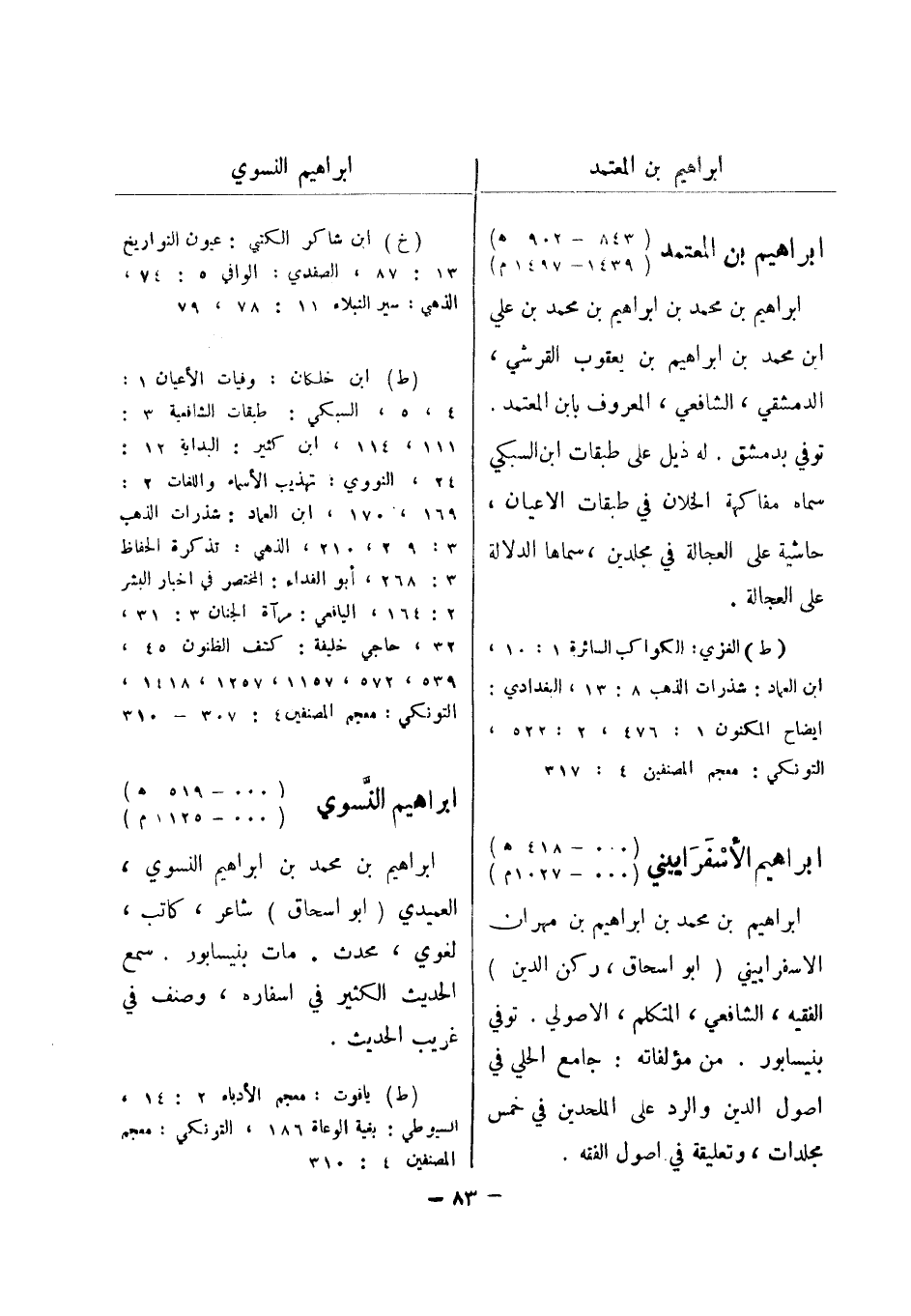 (ط) الغزي: الكواكب السائرة 1: 10، ابن العماد: شذرات الذهب 8: 13، البغدادي: ايضاح المكنون 1: 476، 2: 522، التونكي: معجم المصنفين 4: 317 ابراهيم الاسفراييني (000 - 418 هـ) (000 - 1027 م) ابراهيم بن محمد بن ابراهيم بن مهران الاسفراييني (أبو اسحاق، ركن الدين) الفقيه، الشافعي، المتكلم، الاصولي.