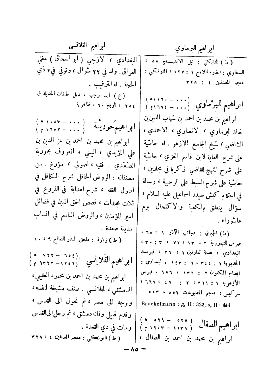 (ط) التنبكتي: نيل الابتهاج 57، السخاوي: الضوء اللامع 1: 127، التونكي: معجم المصنفين 4: 328 ابراهيم البرماوي (000 - 1160 هـ) (000 - 1694 م) ابراهيم بن محمد بن احمد بن شهاب الدين بن خالد البرماوي، الانصاري، الاحمدي، الشافعي، شيخ الجامع الازهر.
