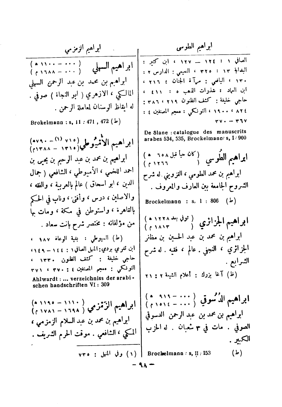 (ط) السيوطي: بغية الوعاة 187، ابن تغري بردي: المنهل الصافي 1: 144 - 149، حاجي خليفة: كشف الظنون 1330، التونكي: معجم المصنفين 4: 370، 371 - Ahlwardt:..verzeichniss der arabi 309: schen handschriften VI ابراهيم الزمزمي (1110 - 1195 هـ) (1698 - 1781 م) ابراهيم بن محمد بن عبد السلام الزمزمي، المكي، الشافعي.