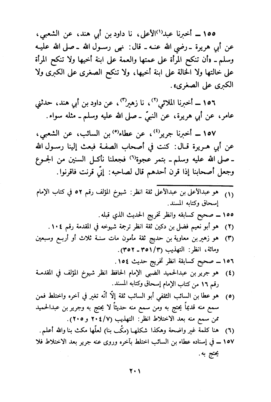 155 - أَخْبَرَنَا عَبْدُ الْأَعْلَى، نا دَاوُدُ بْنُ أَبِي هِنْدَ، عَنِ الشَّعْبِيِّ، عَنْ أَبِي هُرَيْرَةَ رَضِيَ اللَّهُ عَنْهُ قَالَ: «§نَهَى رَسُولُ اللَّهِ صَلَّى اللهُ عَلَيْهِ وَسَلَّمَ أَنْ تُنْكَحَ الْمَرْأَةُ عَلَى عَمَّتِهَا، وَالْعَمَّةُ عَلَى ابْنَةِ أَخِيهَا، وَلَا تُنْكَحُ الْمَرْأَةُ عَلَى خَالَتِهَا، وَلَا الْخَالَةُ عَلَى ابْنَةِ أَخِيهَا، وَلَا تُنْكَحُ الصَّغْرَى عَلَى الْكُبْرَى , وَلَا الْكُبْرَى عَلَى الصَّغْرَى»