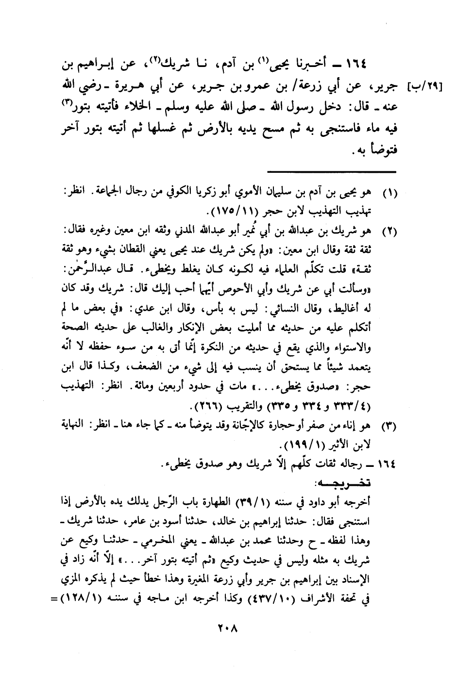 164 - أَخْبَرَنَا يَحْيَى بْنُ آدَمَ، نا شَرِيكٌ، عَنْ إِبْرَاهِيمَ بْنِ جَرِيرٍ، عَنْ أَبِي زُرْعَةَ بْنِ عَمْرِو بْنِ جَرِيرٍ، عَنْ أَبِي هُرَيْرَةَ رَضِيَ اللَّهُ عَنْهُ قَالَ: §دَخَلَ رَسُولُ اللَّهِ صَلَّى اللهُ عَلَيْهِ وَسَلَّمَ الْخَلَاءَ فَأَتَيْتُهُ بِتَوْرٍ فِيهِ مَاءٌ فَاسْتَنْجَى بِهِ، ثُمَّ مَسَحَ يَدَيْهِ بِالْأَرْضِ، ثُمَّ غَسَلَهَا، ثُمَّ أتَيْتُهُ بِتَوْرٍ آخَرَ فَتَوَضَّأَ بِهِ.