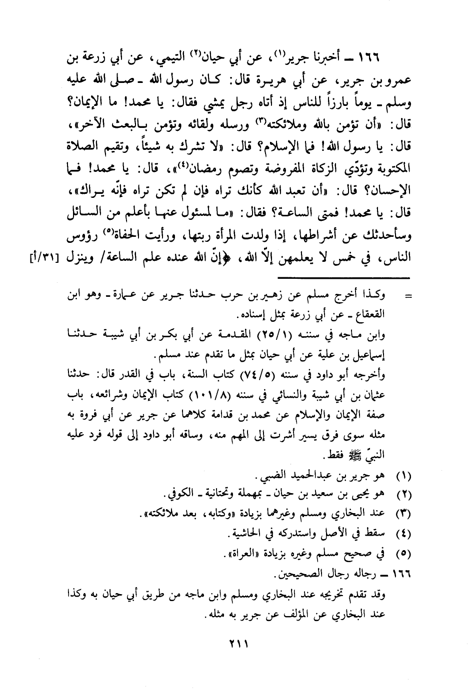 166 - أَخْبَرَنَا جَرِيرٌ، عَنْ أَبِي حَيَّانَ التَّيْمِيِّ، عَنْ أَبِي زُرْعَةَ بْنِ عَمْرِو بْنِ جَرِيرٍ، عَنْ أَبِي هُرَيْرَةَ، قَالَ: كَانَ رَسُولُ اللَّهِ صَلَّى اللهُ عَلَيْهِ وَسَلَّمَ يَوْمًا بَارِزًا لِلنَّاسِ إِذْ أَتَاهُ رَجُلٌ يَمْشِي، فَقَالَ: يَا مُحَمَّدُ مَا §الْإِيمَانُ؟ قَالَ: «أَنْ تُؤْمِنَ بِاللَّهِ وَمَلَائِكَتِهِ وَرُسُلِهِ وَلِقَائِهِ، وَتُؤُمِنَ بِالْبَعْثِ الْآخِرِ» ، قَالَ: يَا رَسُولَ اللَّهِ فَمَا الْإِسْلَامُ قَالَ: «لَا تُشْرِكُ بِهِ شَيْئًا وَتُقِيمُ الصَّلَاةَ الْمَكْتُوبَةَ وَتُؤَدِّي الزَّكَاةَ الْمَفْرُوضَةَ وَتَصُومُ رَمَضَانَ» ، قَالَ: يَا مُحَمَّدُ فَمَا الْإِحْسَانُ؟ قَالَ: «أَنْ تَعْبُدَ اللَّهَ كَأَنَّكَ تَرَاهُ فَإِنْ لَمْ تَكُنْ تَرَاهُ فَإِنَّهُ يَرَاكَ» ، قَالَ: يَا مُحَمَّدُ فَمَتَى السَّاعَةُ؟ فَقَالَ: " مَا الْمَسْئُولُ عَنْهَا بِأَعْلَمَ مِنَ السَّائِلِ وَسَأُحَدِّثُكَ عَنْ أَشْرَاطِهَا إِذَا وَلَدَتِ الْمَرْأَةُ رَبَّتَهَا، وَرَأَيْتَ الْحُفَاةَ رُؤُوسَ النَّاسِ، فِي خَمْسٍ لَا يَعْلَمُهُنَّ إِلَّا اللَّهُ {إِنَّ اللَّهَ عِنْدَهُ عِلْمُ السَّاعَةِ وَيُنَزِّلُ الْغَيْثَ} [لقمان: 34] الْآيَةَ "، ثُمَّ انْصَرَفَ الرَّجُلُ، قَالَ رَسُولُ اللَّهِ صَلَّى اللهُ عَلَيْهِ وَسَلَّمَ: «رُدُّوهُ، الْتَمِسُوهُ» فَلَمْ يَجِدُوهُ، فَقَالَ: «ذَاكَ جِبْرِيلُ جَاءَ لِيُعَلِّمَ النَّاسَ دِينَهُمْ» .