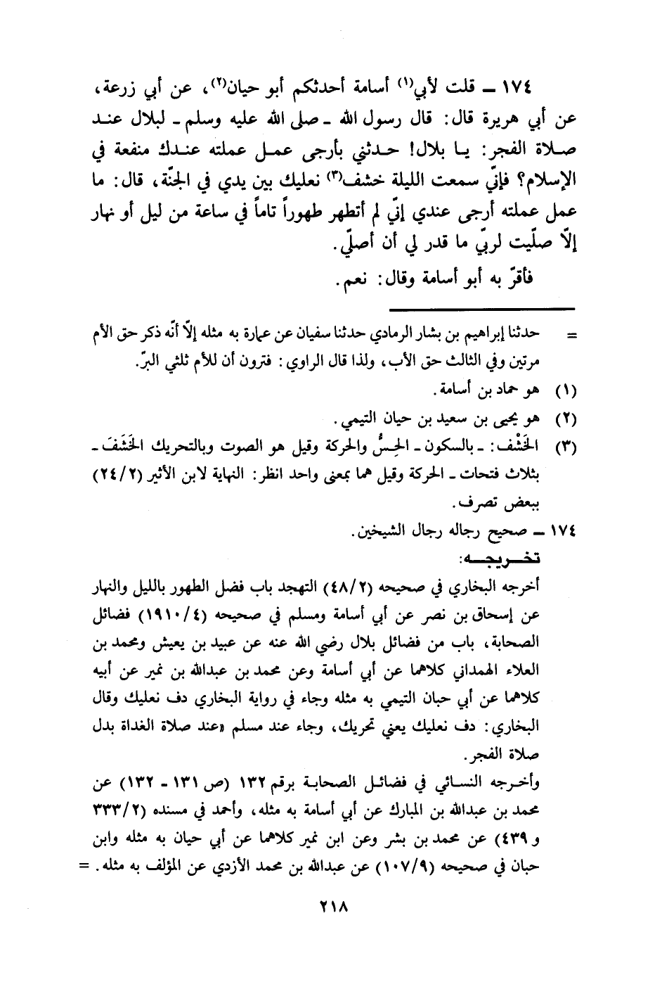 174 - قُلْتُ لِأَبِيَ أُسَامَةَ أَحَدَّثَكُمْ أَبُو حَيَّانَ، عَنْ أَبِي زُرْعَةَ، عَنْ أَبِي هُرَيْرَةَ، قَالَ رَسُولُ اللَّهِ صَلَّى اللهُ عَلَيْهِ وَسَلَّمَ لِبِلَالٍ عِنْدَ صَلَاةِ الْفَجْرِ: «يَا بِلَالُ حَدِّثْنِي بِأَرْجَى عَمَلٍ عَمِلْتَهِ عِنْدَكَ مَنْفَعَةً فِي الْإِسْلَامِ، فَإِنِّي §سَمِعْتُ اللَّيْلَةَ خَشْفَ نَعْلَيْكَ بَيْنَ يَدَيَّ فِي الْجَنَّةِ» قَالَ: مَا عَمَلٌ عَمِلْتُهُ أَرْجَى عِنْدِي إِلَّا إِنِّي لَمْ أَتَطَهَّرْ طُهُورًا تَامًّا فِي سَاعَةٍ مِنْ لَيْلٍ أَوْ نَهَارٍ إِلَّا صَلَّيْتُ لِرَبِّي مَا قُدِّرَ لِي أَنْ أُصَلِّيَ، فَأَقَرَّ بِهِ أَبُو أُسَامَةَ، وَقَالَ: «نَعَمْ» .