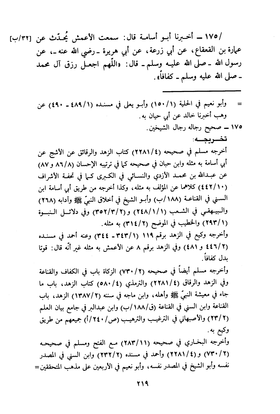 175 - أَخْبَرَنَا أَبُو أُسَامَةَ، قَالَ: سَمِعْتُ الْأَعْمَشَ، يُحَدِّثُ، عَنْ عُمَارَةَ بْنِ الْقَعْقَاعِ، عَنْ أَبِي زُرْعَةَ، عَنْ أَبِي هُرَيْرَةَ رَضِيَ اللَّهُ عَنْهُ، عَنْ رَسُولِ اللَّهِ صَلَّى اللهُ عَلَيْهِ وَسَلَّمَ قَالَ: «§اللَّهُمَّ اجْعَلْ رِزْقَ آلِ مُحَمَّدٍ صَلَّى اللهُ عَلَيْهِ وَسَلَّمَ كَفَافًا» .