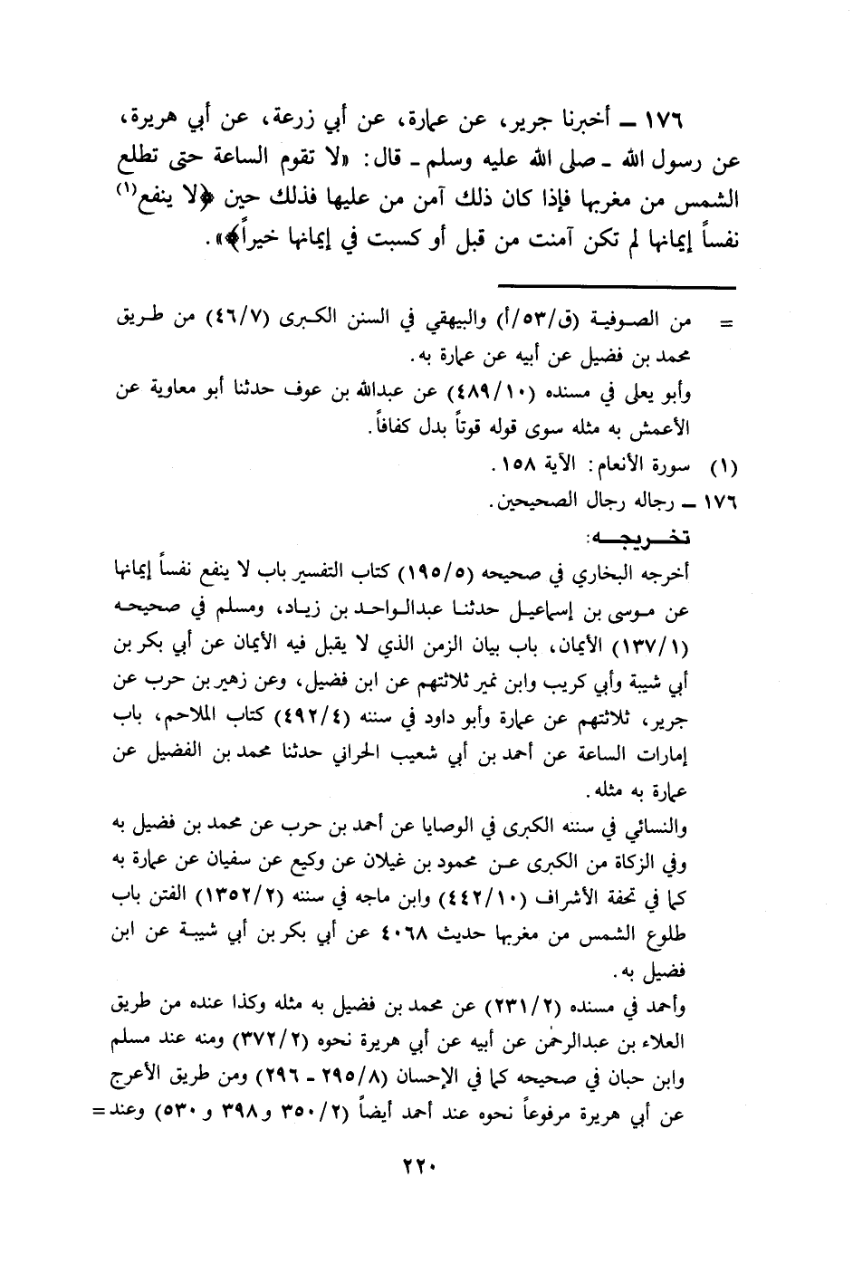 176 - أَخْبَرَنَا جَرِيرٌ، عَنْ عُمَارَةَ، عَنْ أَبِي زُرْعَةَ، عَنْ أَبِي هُرَيْرَةَ، عَنْ رَسُولِ اللَّهِ صَلَّى اللهُ عَلَيْهِ وَسَلَّمَ قَالَ: " §لَا تَقُومُ السَّاعَةُ حَتَّى تَطْلُعَ الشَّمْسُ مِنْ مَغْرِبِهَا، فَإِذَا كَانَ ذَلِكَ آمَنَ مَنْ عَلَيْهَا فَذَلِكَ حِينَ {لَا يَنْفَعُ نَفْسًا إِيمَانُهَا لَمْ تَكُنْ آمَنَتْ مِنْ قَبْلُ أَوْ كَسَبَتْ فِي إِيمَانِهَا خَيْرًا} [الأنعام: 158] ".