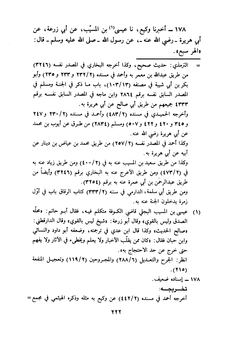 178 - أَخْبَرَنَا وَكِيعٌ، نا عِيسَى بْنُ الْمُسَيَّبِ، عَنْ أَبِي زُرْعَةَ، عَنْ أَبِي هُرَيْرَةَ رَضِيَ اللَّهُ عَنْهُ، عَنْ رَسُولِ اللَّهِ صَلَّى اللهُ عَلَيْهِ وَسَلَّمَ قَالَ: «§الْهِرُّ سَبُعٌ» .