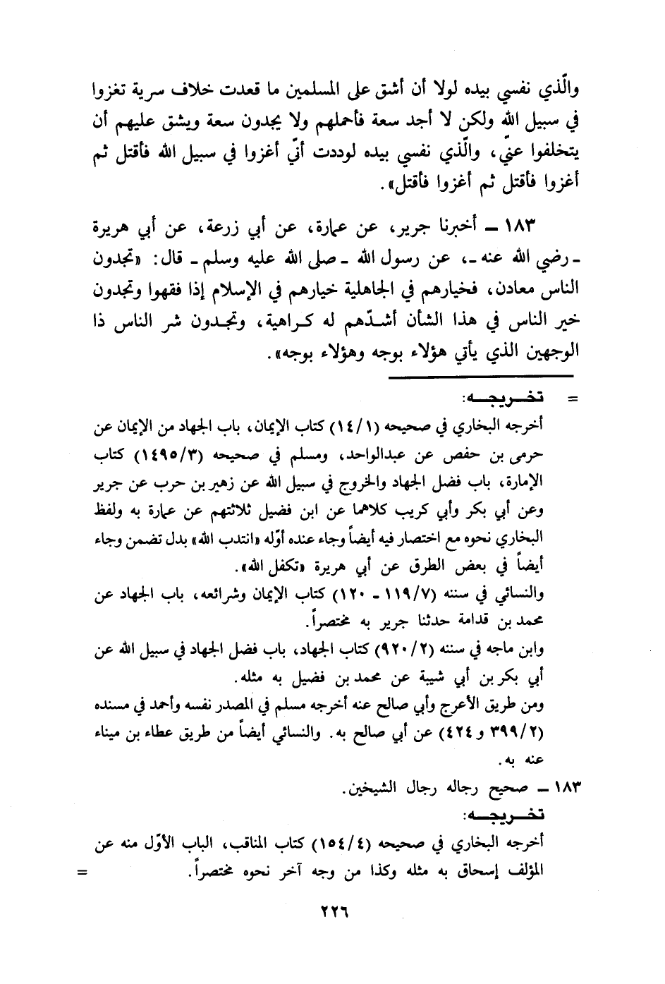 183 - أخبرنا جرير عن عمارة عن أبي زرعة عن أبي هريرة رضي الله عنه عن رسول الله صَلَّى اللهُ عَلَيْهِ وَسَلَّمَ قال تجدون الناس معادن فخيارهم في الجاهلية خيارهم في الإسلام إذا فقهوا وتجدون خير الناس في هذا الشأن أشدهم له كراهية وتجدون شر الناس ذا الوجهين الذي يأتي هؤلاء بوجه وهؤلاء بوجه