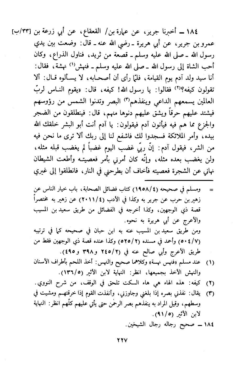 184 - أَخْبَرَنَا جَرِيرٌ، عَنْ عُمَارَةَ بْنِ الْقَعْقَاعِ، عَنْ أَبِي زُرْعَةَ بْنِ عَمْرِو بْنِ جَرِيرٍ، عَنْ أَبِي هُرَيْرَةَ رَضِيَ اللَّهُ عَنْهُ قَالَ: " وَضَعْتُ بَيْنَ يَدَيْ رَسُولِ اللَّهِ صَلَّى اللهُ عَلَيْهِ وَسَلَّمَ قَصْعَةً مِنْ ثَرِيدٍ فَنَاوَلَ الذِّرَاعَ وَكَانَ أَحَبَّ الشَّاةِ إِلَى رَسُولِ اللَّهِ صَلَّى اللهُ عَلَيْهِ وَسَلَّمَ فَنَهَشَ نَهْشَةً، فَقَالَ: §أَنَا سَيِّدُ وَلَدِ آدَمَ يَوْمَ الْقِيَامَةِ "، فَلَمَّا رَأَى أَنَّ أَصْحَابَهُ لَا يَسْأَلُوهُ قَالَ: «أَلَا تَقُولُونَ كَيْفَهْ؟» فَقَالُوا: يَا رَسُولَ اللَّهِ كَيْفَهْ؟، قَالَ: «يَقُومُ النَّاسُ لِرَبِّ الْعَالَمِينَ، يُسْمِعُهُمُ الدَّاعِي وَيُنْفِذُهُمُ الْبَصَرُ، وَتَدْنُوا الشَّمْسُ مِنْ رُؤُوسِهِمْ فَيَشْتَدُّ عَلَيْهِمْ حَرْقًا وَيَشُقُّ عَلَيْهِمْ دُنُوُّهَا مِنْهُمْ» ، قَالَ: " فَيَنْطَلِقُونَ مِنَ الضَّجَرِ وَالْجَزَعِ مِمَّا هُمْ فِيهِ فَيَأْتُونَ آدَمَ فَيَقُولُونَ: يَا آدَمُ، أَنْتَ أَبُو الْبَشَرِ، خَلَقَكَ اللَّهُ بِيَدِهِ، وَأَمَرَ الْمَلَائِكَةَ فَسَجَدُوا لَكَ، فَاشْفَعْ لَنَا إِلَى رَبِّكَ، أَلَا تَرَى مَا نَحْنُ فِيهِ مِنَ الشَّرِّ؟، فَيَقُولُ آدَمُ: إِنَّ رَبِّي غَضِبَ الْيَوْمَ غَضَبًا لَمْ يَغْضَبْ قَبْلَهُ مِثْلَهُ، وَلَنْ يَغْضَبَ بَعْدَهُ مِثْلَهُ، وَإِنَّهُ كَانَ أَمَرَنِي بِأَمْرٍ فَعَصَيْتُهُ وَأَطَعْتُ الشَّيْطَانَ، نَهَانِي عَنِ الشَّجَرَةِ، فَعَصَيْتُهُ فَأَخَافُ أَنْ يَطْرَحَنِي فِي النَّارِ فَانْطَلِقُوا إِلَى غَيْرِي -[228]-، نَفْسِي نَفْسِي، فَيَنْطَلِقُونَ إِلَى نُوحٍ، فَيَقُولُونَ: يَا نُوحُ أَنْتَ نَبِيُّ اللَّهِ وَأَوَّلُ رُسُلِ اللَّهِ، اشْفَعْ لَنَا إِلَى رَبِّكَ أَلَا تَرَى مَا نَحْنُ فِيهِ مِنَ الشَّرِّ؟، فَيَقُولُ نُوحٌ: إِنَّ رَبِّي غَضِبَ الْيَوْمَ غَضَبًا لَمْ يَغْضَبْ قَبْلَهُ مِثْلَهُ وَلَنْ يَغْضَبَ بَعْدَهُ مِثْلَهُ، وَإِنَّهُ كَانَتْ لِي دَعْوَةٌ فَدَعَوْتُ بِهَا عَلَى قَوْمِي فَأُهْلِكُوا، وَإِنِّي أَخَافُ أَنْ يَطْرَحَنِي فِي النَّارِ، انْطَلِقُوا إِلَى غَيْرِي، نَفْسِي نَفْسِي، قَالَ: فَيَنْطَلِقُونَ فَيَأْتُونَ إِبْرَاهِيمَ، فَيَقُولونَ: يَا إِبْرَاهِيمُ أَنْتَ خَلِيلُ اللَّهِ، قَدْ سَمِعَ بِخُلَّتِكُمَا أَهْلُ السَّمَوَاتِ وَأَهْلُ الْأَرْضِ، اشْفَعْ لَنَا إِلَى رَبِّكَ، أَلَا تَرَى مَا نَحْنُ فِيهِ مِنَ الشَّرِّ؟، فَيَقُولُ إِبْرَاهِيمُ: إِنَّ رَبِّي غَضِبَ الْيَوْمَ غَضَبًا لَمْ يَغْضَبْ قَبْلَهُ مِثْلَهُ، وَلَنْ يَغْضَبَ بَعْدَهُ مِثْلَهُ "، وَذَكَرَ الْكَوَاكِبَ، قَوْلَهُ: «إِنَّهُ رَبِّي» ، وَقَوْلَهُ لِآلِهَتِهِمْ: «هَذَا كَبِيرُهُمْ» وَقَوْلَهُ: " إِنِّي سَقِيمٌ، وَإِنِّي أَخَافُ أَنْ يَطْرَحَنِي فِي النَّارِّ انْطَلِقُوا إِلَى غَيْرِي نَفْسِي نَفْسِي، قَالَ: فَيَنْطَلِقُونَ حَتَّى يَأْتُوا مُوسَى فَيَقُولُونَ: يَا مُوسَى أَنْتَ نَبَيُّ اللَّهِ اصْطَفَاكَ اللَّهُ بِرِسَالَاتِهِ وَكَلَّمَكَ تَكْلِيمَا، اشْفَعْ لَنَا إِلَى رَبِّكَ أَلَا تَرَى مَا نَحْنُ فِيهِ مِنَ الشَّرِّ؟، فَقَالَ مُوسَى: إِنَّ رَبِّي غَضِبَ الْيَوْمَ غَضَبًا لَمْ يَغْضَبْ قَبْلَهُ مِثْلَهُ وَلَنْ يَغْضَبَ بَعْدَهُ مِثْلَهُ، وَإِنِّي قَتَلْتُ نَفْسَا لَمْ أُؤْمَرْ بِهَا، فَأَخَافُ أَنْ يَطْرَحَنِي فِي النَّارِّ انْطَلِقُوا إِلَى غَيْرِي نَفْسِي نَفْسِي، قَالَ: فَيَنْطَلِقُونَ حَتَّى يَأْتُوا عِيسَى فَيَقُولُونَ: يَا عِيسَى أَنْتَ نَبِيُّ اللَّهِ وَكَلِمَتُهُ وَرُوحُهُ أَلْقَاهَا عَلَى مَرْيَمَ وَرُوحٌ مِنْهُ، اشْفَعْ لَنَا إِلَى رَبِّكَ أَلَا تَرَى مَا نَحْنُ فِيهِ مِنَ الشَّرِّ؟، فَيَقُولُ عِيسَى: إِنَّ رَبِّي غَضِبَ الْيَوْمَ غَضَبًا لَمْ ي