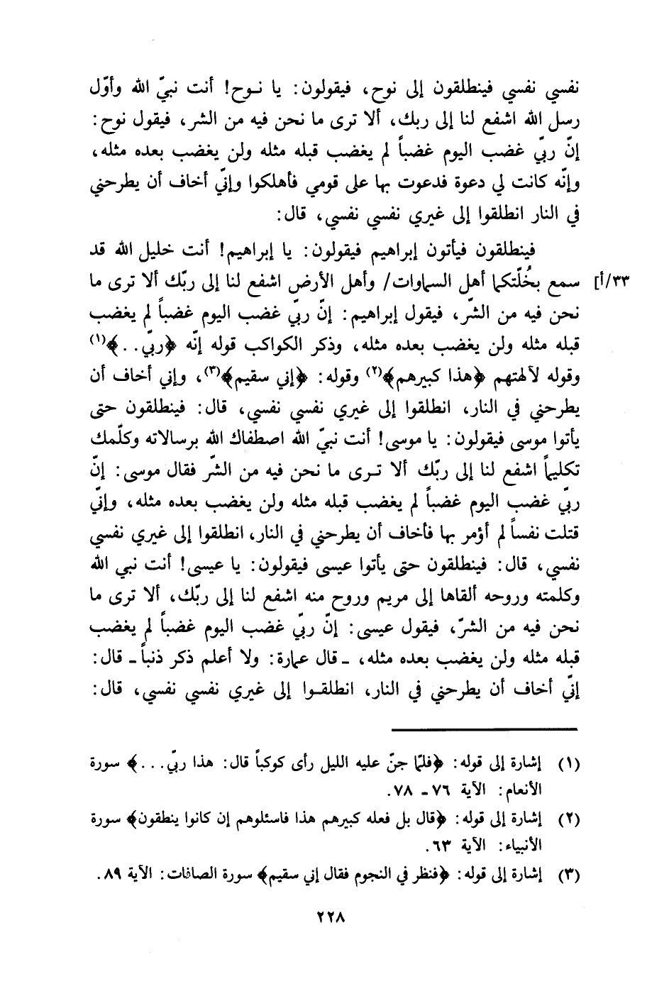 فَيَقُولُ إِبْرَاهِيمُ : إِنَّ رَبِّي غَضِبَ الْيَوْمَ غَضَبًا لَمْ يَغْضَبْ قَبْلَهُ مِثْلَهُ ، وَلَنْ يَغْضَبَ بَعْدَهُ مِثْلَهُ ، وَذَكَرَ الْكَوَاكِبَ ، قَوْلَهُ : إِنَّهُ رَبِّي ، وَقَوْلَهُ لآلِهَتِهِمْ : هَذَا كَبِيرُهُمْ ، وَقَوْلَهُ : إِنِّي سَقِيمٌ ، وَإِنِّي أَخَافُ أَنْ يَطْرَحَنِي فِي النَّارِّ ، انْطَلِقُوا إِلَى غَيْرِي ، نَفْسِي نَفْسِي ، قَالَ : فَيَنْطَلِقُونَ حَتَّى يَأْتُوا مُوسَى ، فَيَقُولُونَ : يَا مُوسَى أَنْتَ نَبَيُّ اللَّهِ ، اصْطَفَاكَ اللَّهُ بِرِسَالاَتِهِ ، وَكَلَّمَكَ تَكْلِيمَا ، اشْفَعْ لَنَا إِلَى رَبِّكَ ، أَلاَ تَرَى مَا نَحْنُ فِيهِ مِنَ الشَّرِّ ؟ فَقَالَ مُوسَى : إِنَّ رَبِّي غَضِبَ الْيَوْمَ غَضَبًا لَمْ يَغْضَبْ قَبْلَهُ مِثْلَهُ ، وَلَنْ يَغْضَبَ بَعْدَهُ مِثْلَهُ ، وَإِنِّي قَتَلْتُ نَفْسَا لَمْ أُؤْمَرْ بِهَا ، فَأَخَافُ أَنْ يَطْرَحَنِي فِي النَّارِّ ، انْطَلِقُوا إِلَى غَيْرِي ، نَفْسِي نَفْسِي ، قَالَ : فَيَنْطَلِقُونَ حَتَّى يَأْتُوا عِيسَى ، فَيَقُولُونَ : يَا عِيسَى أَنْتَ نَبِيُّ اللَّهِ وَكَلِمَتُهُ وَرُوحُهُ أَلْقَاهَا إِلَى مَرْيَمَ وَرُوحٌ مِنْهُ ، اشْفَعْ لَنَا إِلَى رَبِّكَ أَلاَ تَرَى مَا نَحْنُ فِيهِ مِنَ الشَّرِّ ؟ فَيَقُولُ عِيسَى : إِنَّ رَبِّي غَضِبَ الْيَوْمَ غَضَبًا لَمْ يَغْضَبْ قَبْلَهُ مِثْلَهُ ، وَلَنْ يَغْضَبَ بَعْدَهُ مِثْلَهُ ،- قَالَ عُمَارَةُ : وَلاَ أَعْلَمُ ذَكَرَ ذَنْبًا -، قَالَ : إِنِّي أَخَافُ أَنْ يَطْرَحَنِي فِي النَّارِّ ، انْطَلِقُوا إِلَى غَيْرِي ، نَفْسِي نَفْسِي ، قَالَ : فَيَنْطَلِقُونَ فَيَأْتُونَ فَيَقُولُونَ : يَا مُحَمَّدُ أَنْتَ رَسُولُ اللَّهِ وَخَاتَمُ النَّبِيِّينَ قَدْ غَفَرَ اللَّهُ لكَ مَا تَقَدَّمَ مِنْ ذَنْبِكَ وَمَا تَأَخَّرَ ، اشْفَعْ لَنَا إِلَى رَبِّكَ ، قَالَ : فَأَنْطَلِقُ فَآتِي تَحْتَ الْعَرْشِ فَأَقَعُ سَاجِدًا لِرَبِّي فَيُقِيمُنِي رَبُّ الْعَالَمِينَ مَقَامًا لَمْ يَقُمْهُ أَحَدٌ قَبْلِي ، فَيَقُولُ يَا مُحَمَّدُ : اشْفَعْ تُشَفَّعْ ، وَسَلْ تُعْطَهْ : فَأَقُولُ يَا رَبِّ أُمَّتِي أُمَّتِي ، فَيَقُولُ اللَّهُ لَهُ : أَدْخِلْ مَنْ لاَ حِسَابَ عَلَيْهِ مِنْ أُمَّتِكَ الْبَابَ الأَيْمَنَ وَهُمْ شُرَكَاءُ النَّاسِ فِي الأَبْوَابِ الأُخَرِ ، وَالَّذِي نَفْسُ مُحَمَّدٍ بِيَدِهِ ، مَا بَيْنَ الْبَابِ إِلَى الْبَابِ كَمَا بَيْنَ مَكَّةَ وَهَجَرَ أَوْ مَكَّةَ وَبُصْرَى.