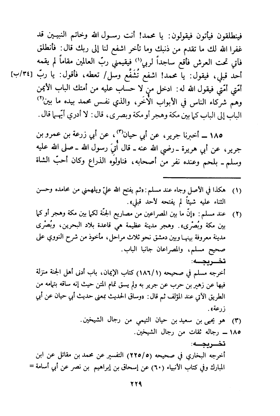185 - أَخْبَرَنَا جَرِيرٌ، عَنْ أَبِي حَيَّانَ، عَنْ أَبِي زُرْعَةَ بْنِ عَمْرِو بْنِ جَرِيرٍ، عَنْ أَبِي هُرَيْرَةَ رَضِيَ اللَّهُ عَنْهُ قَالَ: أُتِيَ رَسُولُ اللَّهِ صَلَّى اللهُ عَلَيْهِ وَسَلَّمَ بِلَحْمٍ وَعِنْدَهُ نَفَرٌ مِنْ أَصْحَابِهِ §فَنَاوَلُوهُ الذِّرَاعَ وَكَانَ أَحَبَّ الشَّاةِ إِلَيْهِ فَنَهَشَ نَهْشَةً، فَذَكَرَ مِثْلَ حَدِيثِ عُمَارَةَ وَقَالَ فِي الْحَدِيثِ فِي ذِكْرِ عِيسَى وَلَمْ يَذْكُرْ ذَنْبًا وَقَالَ: مَا بَيْنَ الْمِصْرَاعَيْنِ كَمَا بَيْنَ بُصْرَى وَمَكَّةَ أَوْ مَكَّةَ وَهَجَرَ
