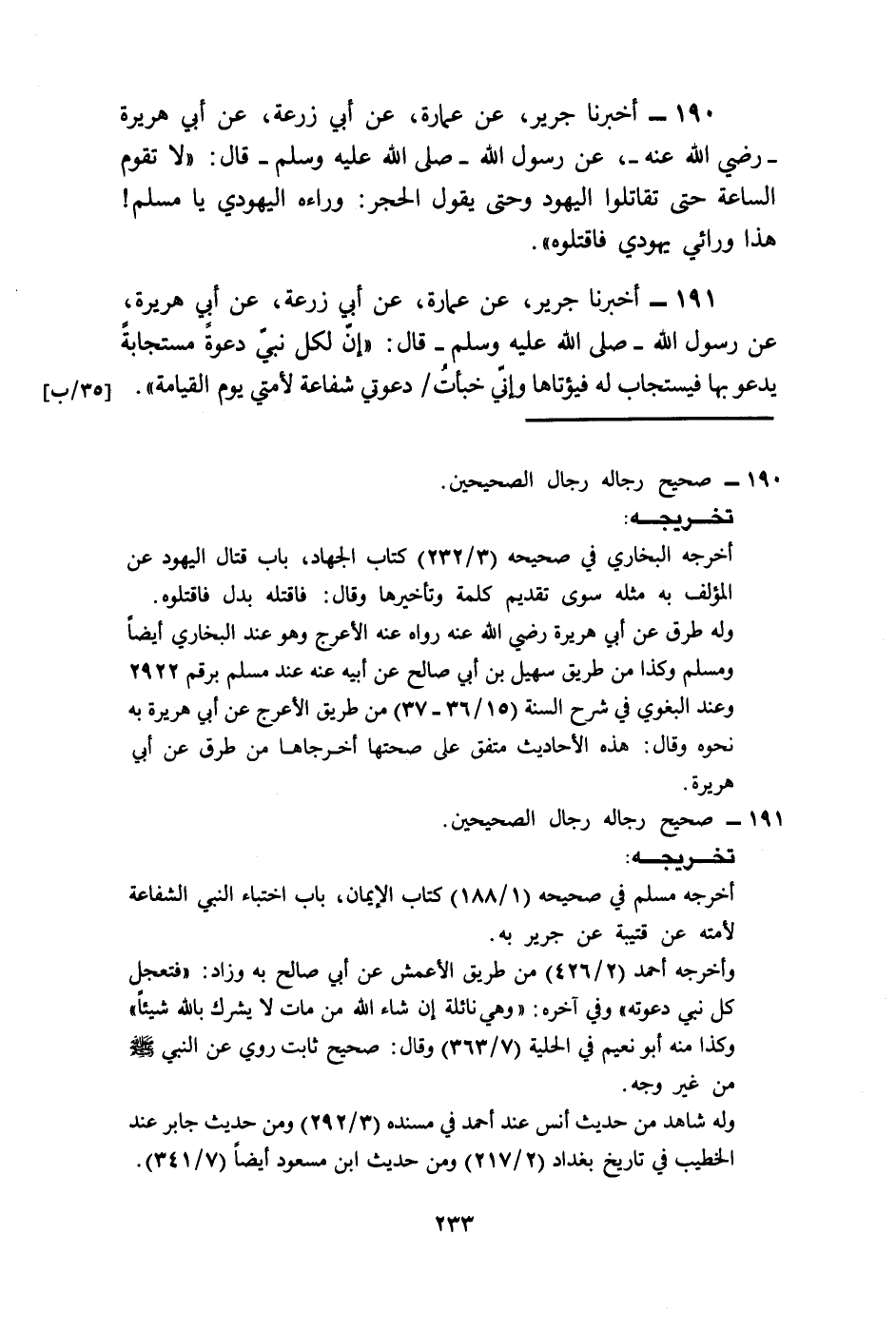 190 - أَخْبَرَنَا جَرِيرٌ، عَنْ عُمَارَةَ، عَنْ أَبِي زُرْعَةَ، عَنْ أَبِي هُرَيْرَةَ رَضِيَ اللَّهُ عَنْهُ، عَنْ رَسُولِ اللَّهِ صَلَّى اللهُ عَلَيْهِ وَسَلَّمَ قَالَ: " §لَا تَقُومُ السَّاعَةُ حَتَّى تُقَاتِلُوا الْيَهُودَ، وَحَتَّى يَقُولَ الْحَجَرُ وَرَاءَهُ الْيَهُودِيُّ: يَا مُسْلِمُ هَذَا وَرَائِي يَهُودِيٌّ فَاقْتُلُوهُ ".