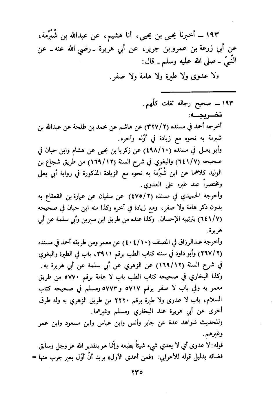 193 - أَخْبَرَنَا يَحْيَى بْنُ يَحْيَى، أنا هُشَيْمٌ، عَنْ عَبْدِ اللَّهِ بْنِ شُبْرُمَةَ، عَنْ أَبِي زُرْعَةَ بْنِ عَمْرِو بْنِ جَرِيرٍ، عَنْ أَبِي هُرَيْرَةَ رَضِيَ اللَّهُ عَنْهُ، عَنِ النَّبِيِّ صَلَّى اللهُ عَلَيْهِ وَسَلَّمَ قَالَ: «§لَا عَدْوَى وَلَا طِيَرَةَ وَلَا هَامَةَ وَلَا صَفَرَ»