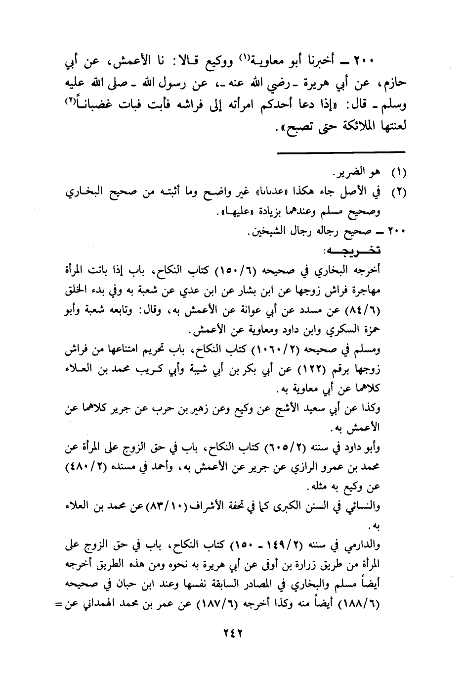 200 - أَخْبَرَنَا أَبُو مُعَاوِيَةَ، وَوَكِيعٌ، قَالَا نا الْأَعْمَشُ، عَنْ أَبِي حَازِمٍ، عَنْ أَبِي هُرَيْرَةَ رَضِيَ اللَّهُ عَنْهُ، عَنْ رَسُولِ اللَّهِ صَلَّى اللهُ عَلَيْهِ وَسَلَّمَ قَالَ: «§إِذَا دَعَا أَحَدُكُمُ امْرَأَتَهُ عَلَى فِرَاشِهِ فَأَبَتْ فَبَاتَ غَضْبَانًا لَعَنَتْهَا الْمَلَائِكَةُ حَتَّى تُصْبِحَ» .