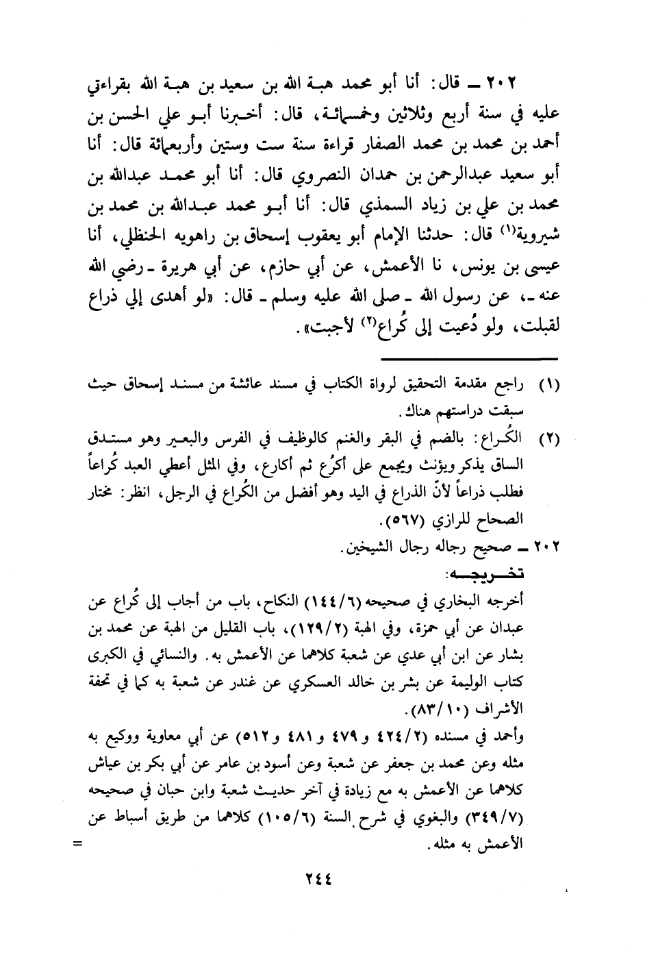 202 - قَالَ: أنا أَبُو مُحَمَّدٍ هِبَةُ اللَّهِ بْنُ سَعِيدِ بْنِ هِبَةِ اللَّهِ بِقِرَاءَتِي عَلَيْهِ فِي سَنَةِ أَرْبَعٍ وَثَلَاثِينَ وَخَمْسِمِائَةٍ، قَالَ: أَخْبَرَنَا أَبُو عَلِيٍّ الْحَسَنُ بْنُ أَحْمَدَ بْنِ مُحَمَّدِ بْنِ مُحَمَّدٍ الصَّفَّارُ قِرَاءَةً سَنَةَ سِتٍّ وَسِتِّينَ وَأَرْبَعمِائَةٍ، قَالَ: أنا أَبُو سَعِيدٍ عَبْدُ الرَّحْمَنِ بْنُ حَمْدَانَ النَّصْرَوِيُّ، قَالَ: أنا أَبُو مُحَمَّدٍ عَبْدُ اللَّهِ بْنُ مُحَمَّدِ بْنِ عَلِيِّ بْنِ زِيَادٍ السِّمِّذِيُّ قَالَ: أنا أَبُو مُحَمَّدٍ عَبْدُ اللَّهِ بْنُ مُحَمَّدِ بْنِ شِيرَوَيْهِ قَالَ: حَدَّثَنَا الْإِمَامُ أَبُو يَعْقُوبَ إِسْحَاقُ بْنُ رَاهَوَيْهِ الْحَنْظَلِيُّ، أنا عِيسَى بْنُ يُونُسَ، نا الْأَعْمَشُ، عَنْ أَبِي حَازِمٍ، عَنْ أَبِي هُرَيْرَةَ رَضِيَ اللَّهُ عَنْهُ، عَنْ رَسُولِ اللَّهِ صَلَّى اللهُ عَلَيْهِ وَسَلَّمَ قَالَ: «§لَوْ أُهْدِيَ إِلَيَّ ذِرَاعٌ لَقَبِلْتُ وَلَوْ دُعِيتُ إِلَى كُرَاعٍ لَأَجَبْتُ» .