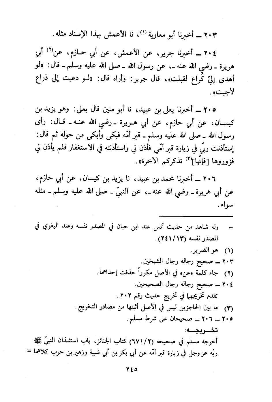 205 - أَخْبَرَنَا يَعْلَى بْنُ عُبَيْدٍ، نا أَبُو مُنَيْنٍ، قَالَ يَعْلَى وَهُوَ يَزِيدُ بْنُ كَيْسَانَ، عَنْ أَبِي حَازِمٍ، عَنْ أَبِي هُرَيْرَةَ رَضِيَ اللَّهُ عَنْهُ قَالَ: رَأَى رَسُولُ اللَّهِ صَلَّى اللهُ عَلَيْهِ وَسَلَّمَ قَبْرَ أُمِّهِ فَبَكَى وَأَبْكَى مَنْ حَوْلَهُ، ثُمَّ قَالَ: «§اسْتَأَذَنْتُ رَبِّي فِي زِيَارَةِ قَبْرِ أُمِّي فَأَذِنَ لِي وَاسْتَأْذَنْتُهُ فِي الِاسْتِغْفَارِ فَلَمْ يَأْذَنْ لِي فَزُورُوهَا فَإِنَّهَا تُذَكِّرُكُمُ الْآخِرَةَ» .
