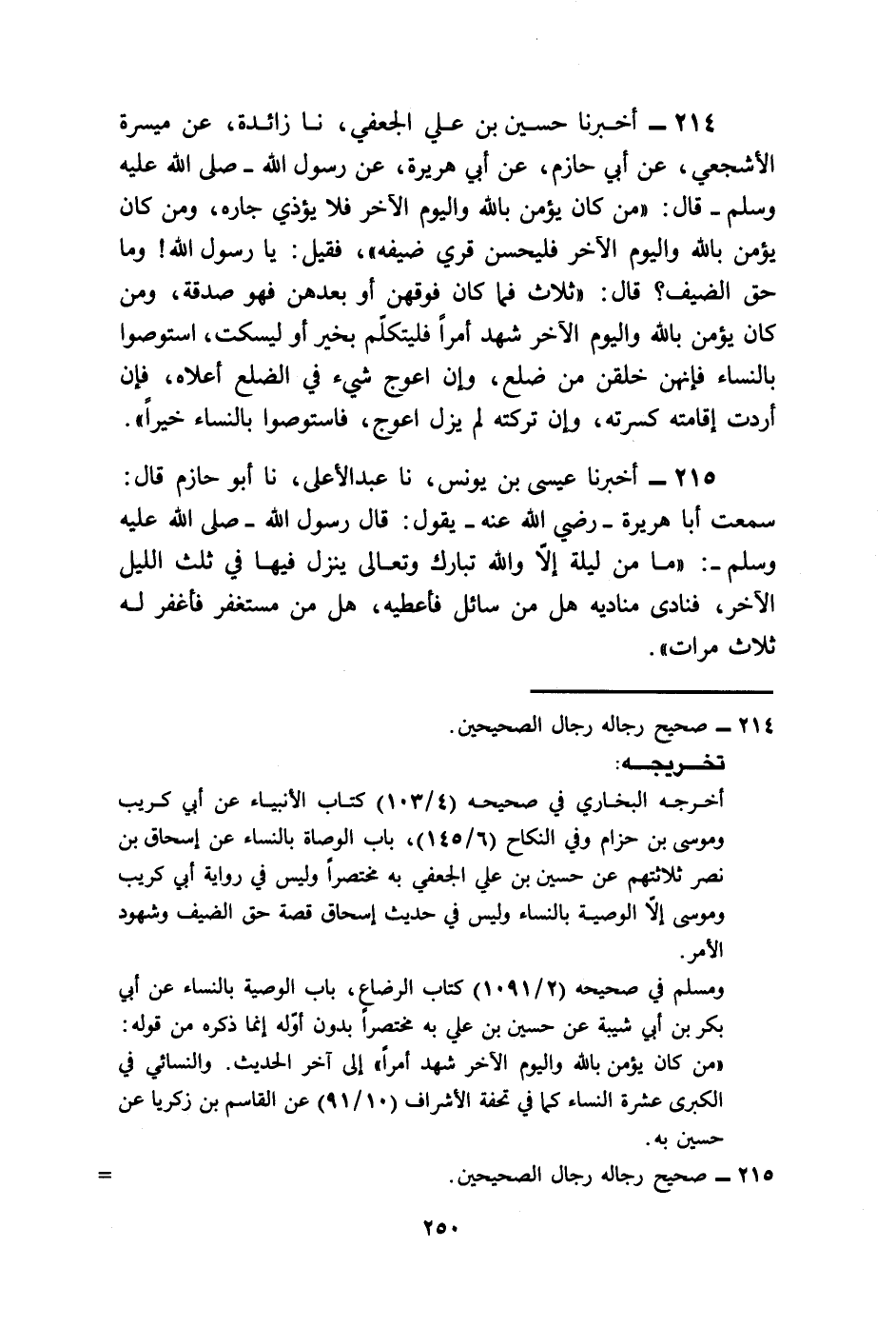 214 - أَخْبَرَنَا حُسَيْنُ بْنُ عَلِيٍّ الْجُعْفِيُّ، نا زَائِدَةُ، عَنْ مَيْسَرَةَ الْأَشْجَعِيِّ، عَنْ أَبِي حَازِمٍ، عَنْ أَبِي هُرَيْرَةَ، عَنْ رَسُولِ اللَّهِ صَلَّى اللهُ عَلَيْهِ وَسَلَّمَ قَالَ: «§مَنْ كَانَ يُؤْمِنُ بِاللَّهِ وَالْيَوْمِ الْآخِرِ فَلَا يُؤْذِ جَارَهُ، وَمَنْ كَانَ يُؤْمِنُ بِاللَّهِ وَالْيَوْمِ الْآخِرِ فَلْيُحْسِنْ قِرَى ضَيْفِهِ» ، فَقِيلَ: يَا رَسُولَ اللَّهِ وَمَا حَقُّ الضَّيْفِ؟ قَالَ: «ثَلَاثٌ فَمَا كَانَ فَوْقَهُنَّ أَوْ بَعْدَهُنَّ فَهُوَ صَدَقَةٌ، وَمَنْ كَانَ يُؤْمِنُ بِاللَّهِ وَالْيَوْمِ الْآخِرِ شَهِدَ أَمْرًا فَلْيَتَكَلَّمْ بِخَيْرٍ أَوْ لِيسْكُتْ، اسْتَوْصُوا بِالنِّسَاءِ فَإِنَّهُنَّ خُلِقْنَ مِنْ ضِلْعٍ، وَإِنَّ أَعْوَجَ شَيْءٍ فِي الضِّلْعِ أَعْلَاهُ فَإِنْ أَرَدْتَ إِقَامَتَهُ كَسَرْتَهُ وَإِنْ تَرَكْتَهُ لَمْ يَزَلْ أَعْوَجَ، فَاسْتَوْصُوا بِالنِّسَاءِ خَيْرًا» .