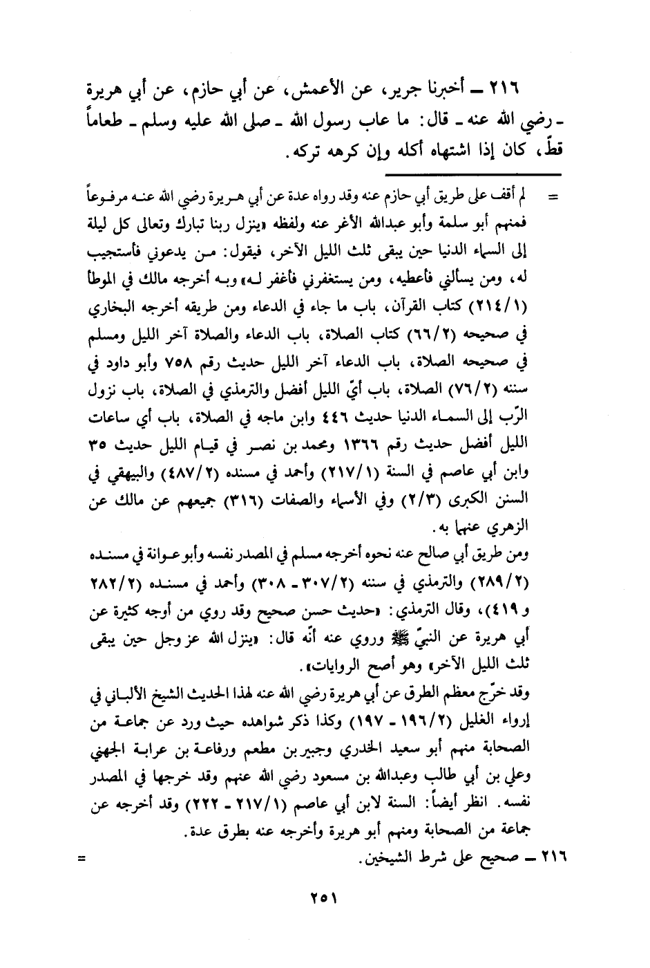 216 - أَخْبَرَنَا جَرِيرٌ، عَنِ الْأَعْمَشِ، عَنْ أَبِي حَازِمٍ، عَنْ أَبِي هُرَيْرَةَ رَضِيَ اللَّهُ عَنْهُ قَالَ: «§مَا عَابَ رَسُولُ اللَّهِ صَلَّى اللهُ عَلَيْهِ وَسَلَّمَ طَعَامًا قَطُّ، كَانَ إِذَا اشْتَهَاهُ أَكَلَهُ وَإِنْ كَرِهَهُ تَرَكَهُ» .