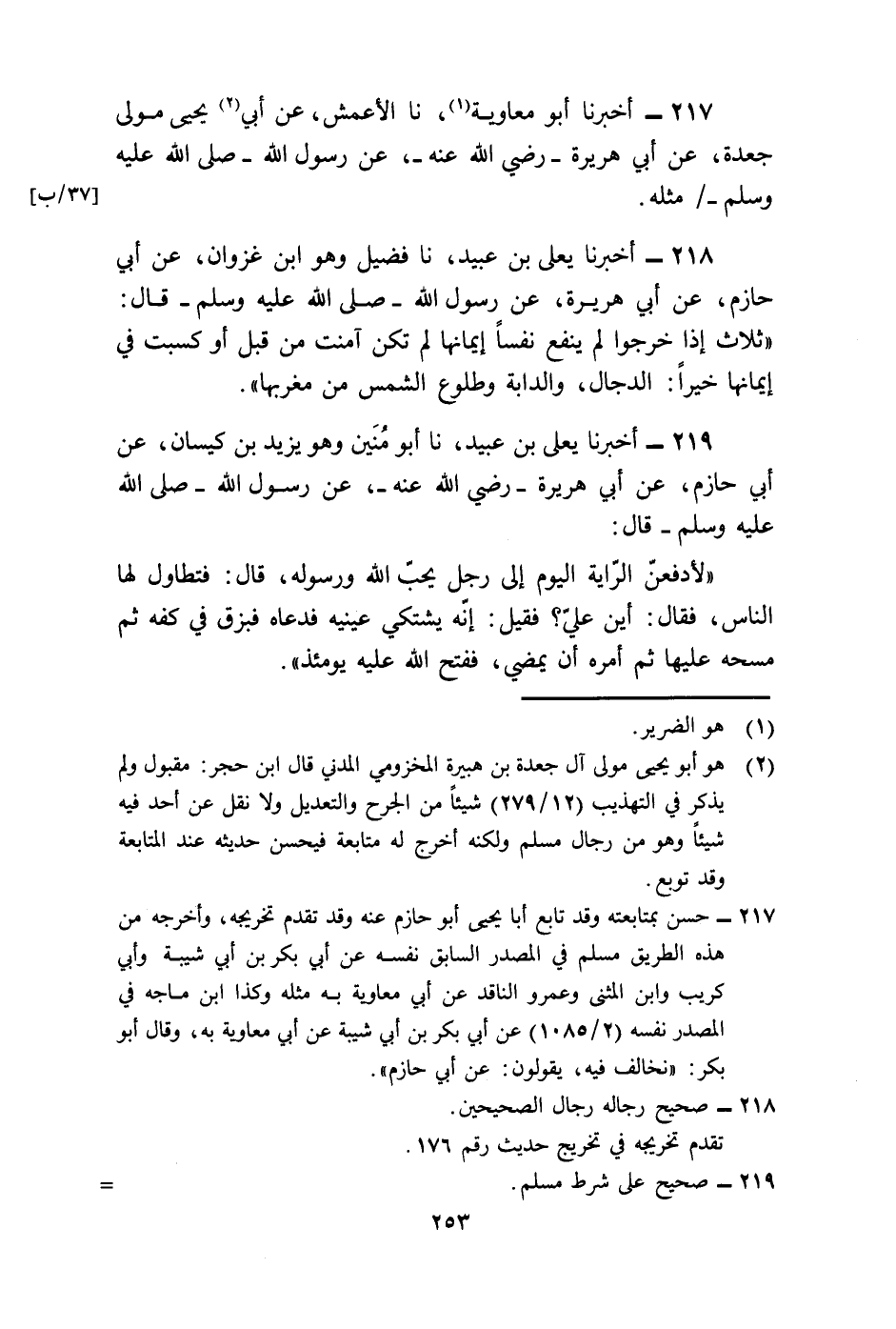 218 - أَخْبَرَنَا يَعْلَى بْنُ عُبَيْدٍ، نا فُضَيْلٌ وَهُوَ ابْنُ غَزْوَانَ، عَنْ أَبِي حَازِمٍ، عَنْ أَبِي هُرَيْرَةَ، عَنْ رَسُولِ اللَّهِ صَلَّى اللهُ عَلَيْهِ وَسَلَّمَ قَالَ: " §ثَلَاثٌ إِذَا خَرَجُوا لَمْ يَنْفَعْ نَفْسًا إِيمَانُهَا لَمْ تَكُنْ آمَنَتْ مِنْ قَبْلُ أَوْ كَسَبَتْ فِي إِيمَانِهَا خَيْرًا: الدَّجَّالُ وَالدَّابَّةُ، وَطُلُوعُ الشَّمْسِ مِنْ مَغْرِبِهَا ".