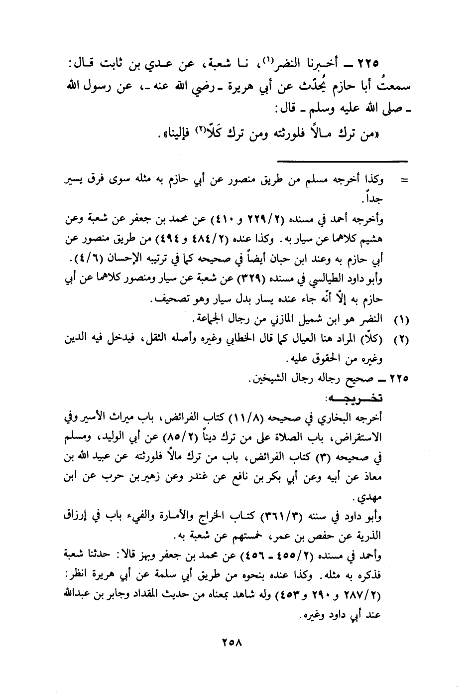 225 - أَخْبَرَنَا النَّضْرُ، نا شُعْبَةُ، عَنْ عَدِيِّ بْنِ ثَابِتٍ، قَالَ: سَمِعْتُ أَبَا حَازِمٍ، يُحَدِّثُ عَنْ أَبِي هُرَيْرَةَ رَضِيَ اللَّهُ عَنْهُ، عَنْ رَسُولِ اللَّهِ صَلَّى اللهُ عَلَيْهِ وَسَلَّمَ قَالَ: «§مَنْ تَرَكَ مَالًا فَلِوَرِثَتِهِ، وَمَنْ تَرَكَ كَلًّا فَإِلَيْنَا» .